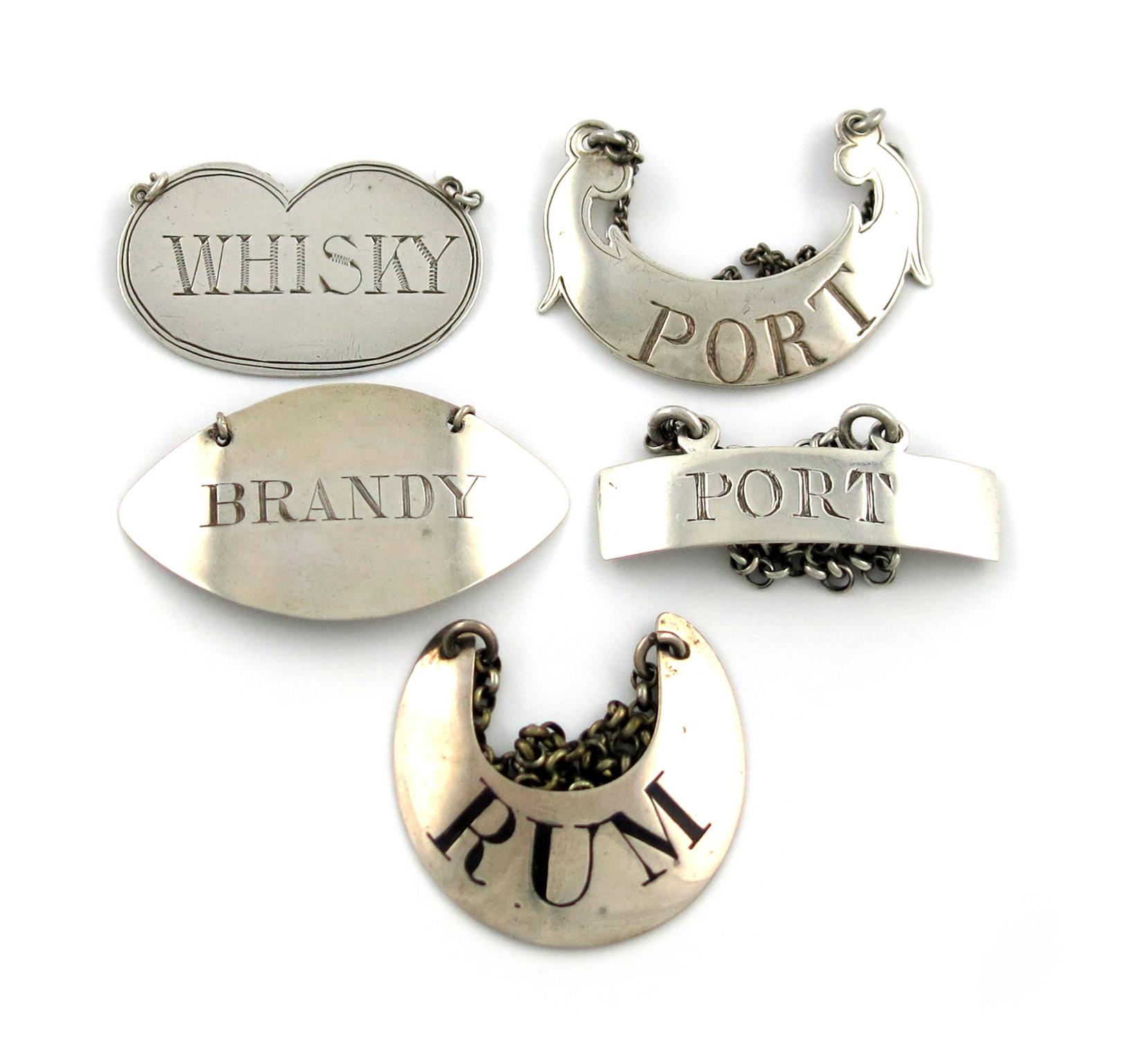A small collection of five silver wine labels, comprising one of crescent form, the reverse with unidentified marks, incised and blackened 'RUM', plus one marked Sterling incised 'WHISKY', plus two 'PORT' and one 'BRANDY'. (5)