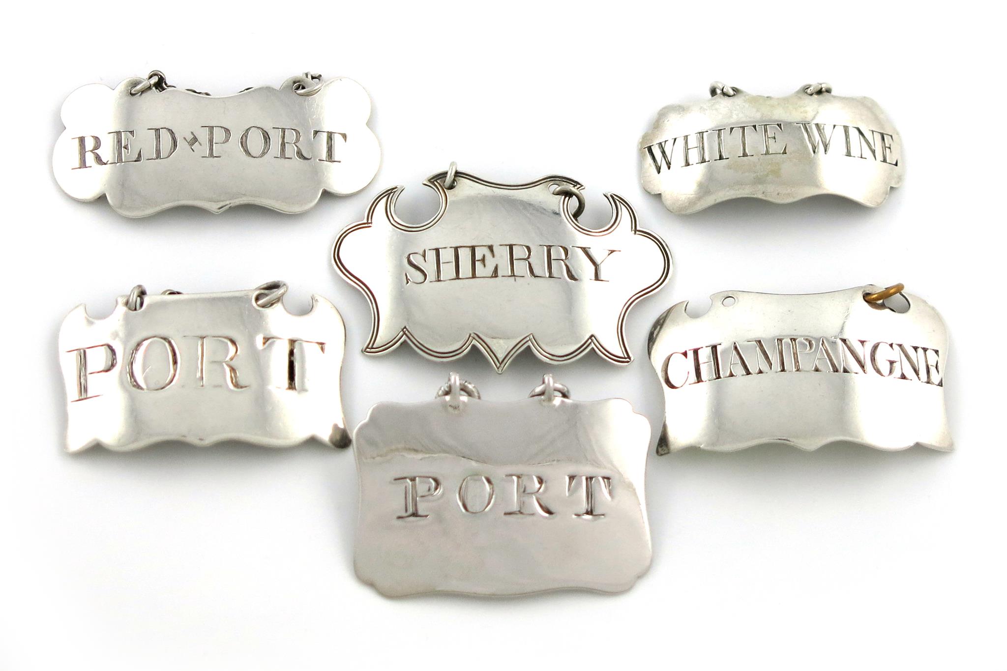 plain cartouche and shaped rectangular form, incised 'CHAMPANGNE', 'PORT', (x2), 'WHITE WINE', 'RED.PORT', and 'SHERRY', approx. weight 1.5oz. (6)