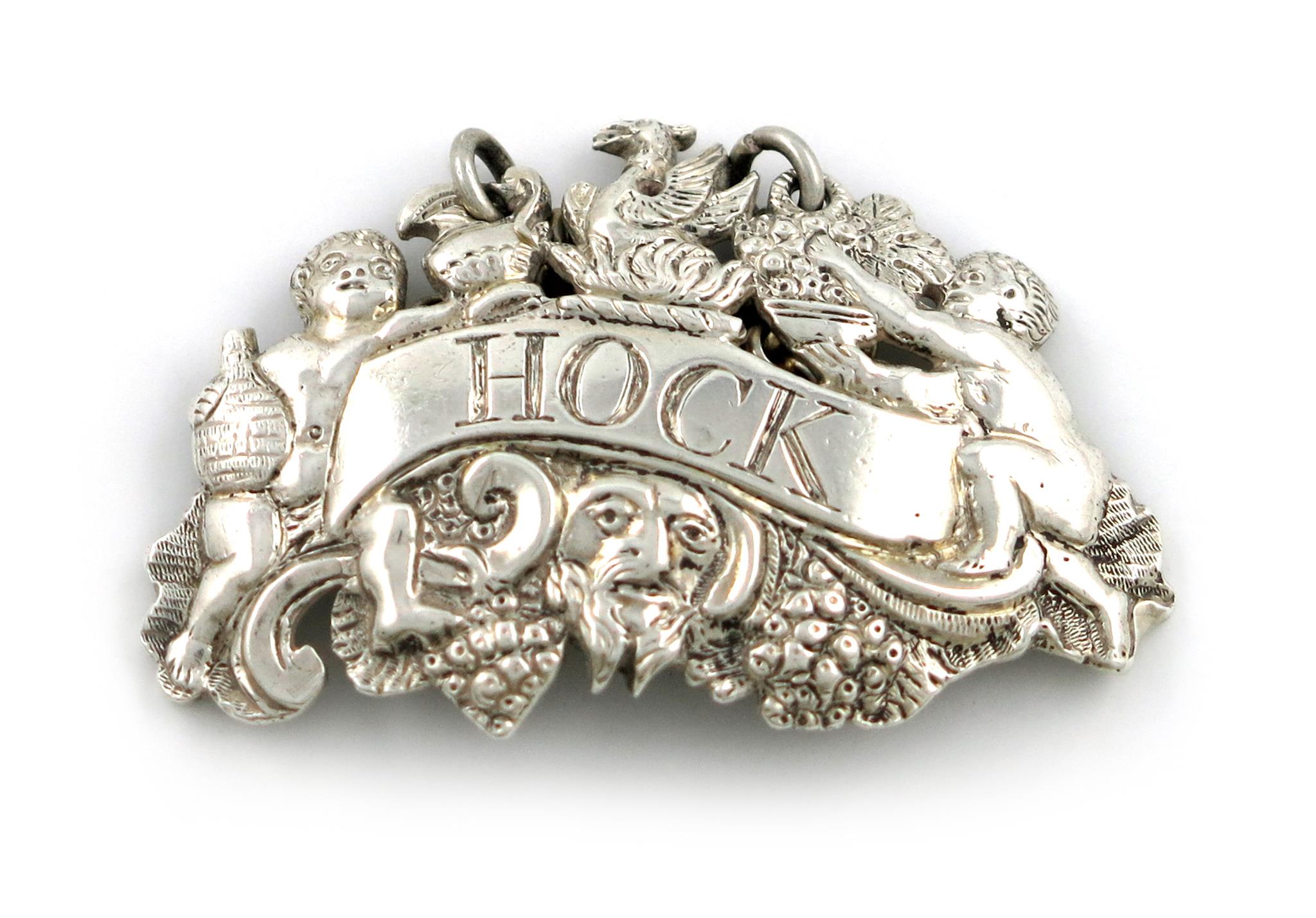 A George II provincial silver wine label, by Isaac Cookson, Newcastle circa 1750, two cupid form, with an urn and ewer with trailing grapevines and a Bacchus mask, incised 'HOCK', length 5.8cm, approx. weight 0.9oz.