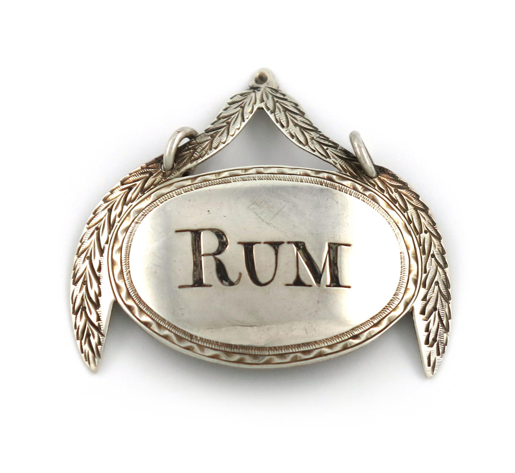 shaped oval form, with an engraved foliate pediment sitting on a barrel, with vine and shell decoration, incised and blackened 'RUM', length 4.5cm, approx. weight 0.2oz.