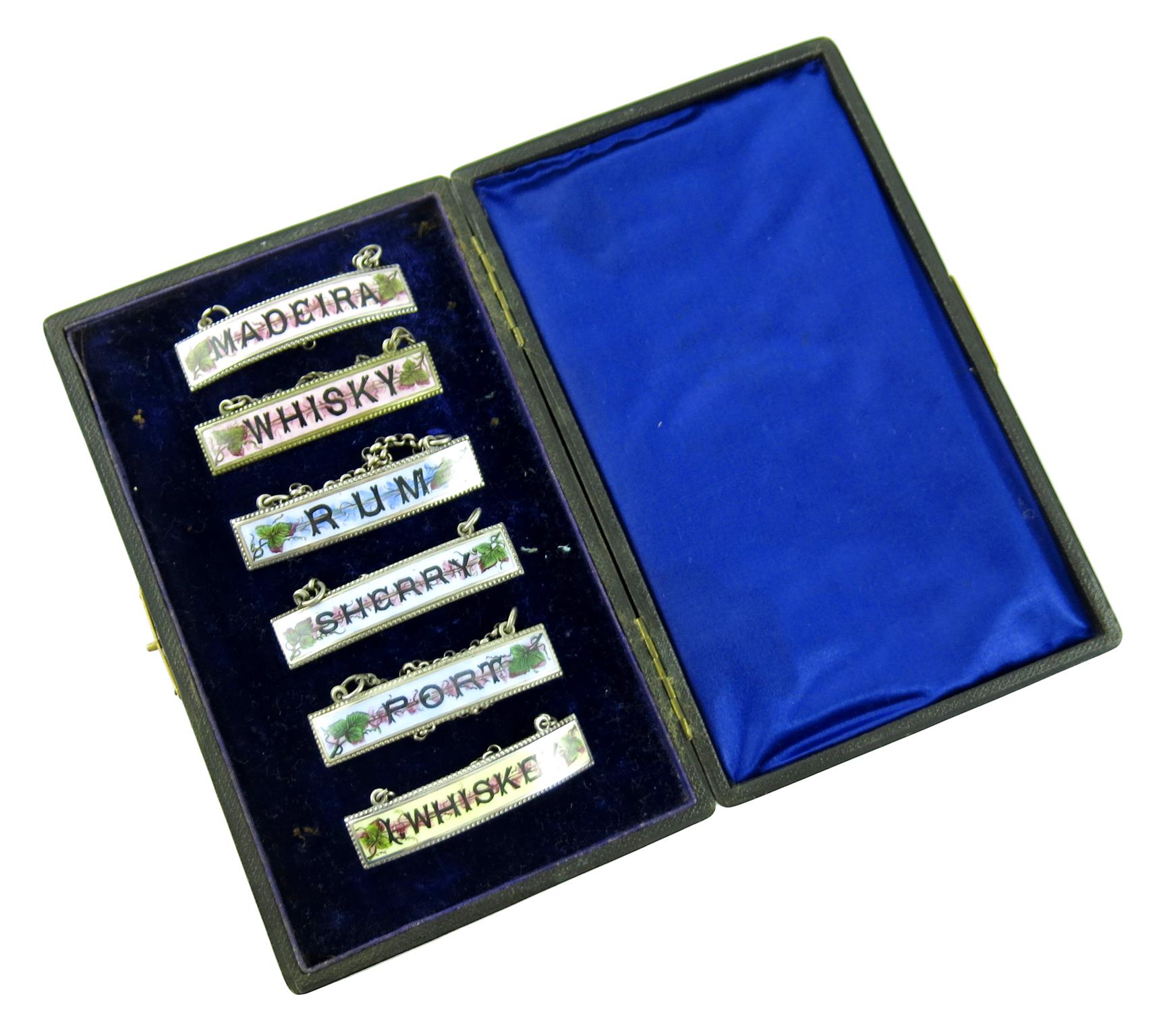 narrow rectangular form, beaded borders, the centres enamelled 'WHISKEY', 'SHERRY', 'PORT', 'RUM', 'MADEIRA' and 'WHISKY', in a case. (6)