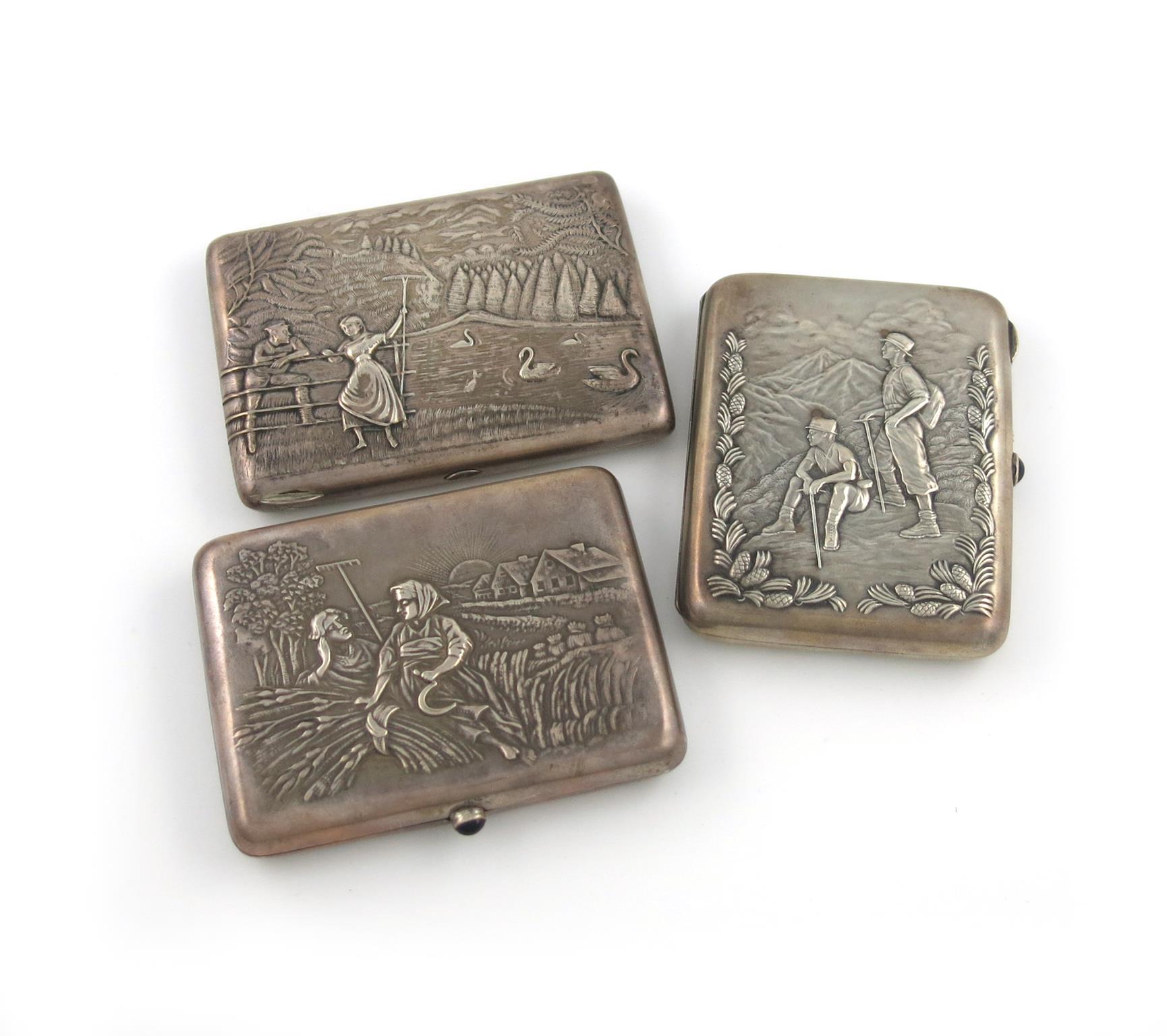 rectangular form, one embossed with two hikers in a landscape scene, and two embossed with farming scenes of men and women in landscape settings, approx. weight 17.5oz. (3)