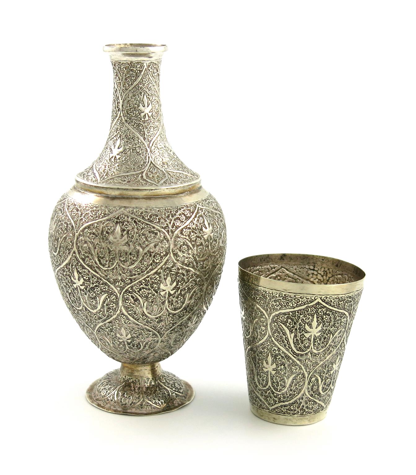 An Indian silver water bottle and beaker