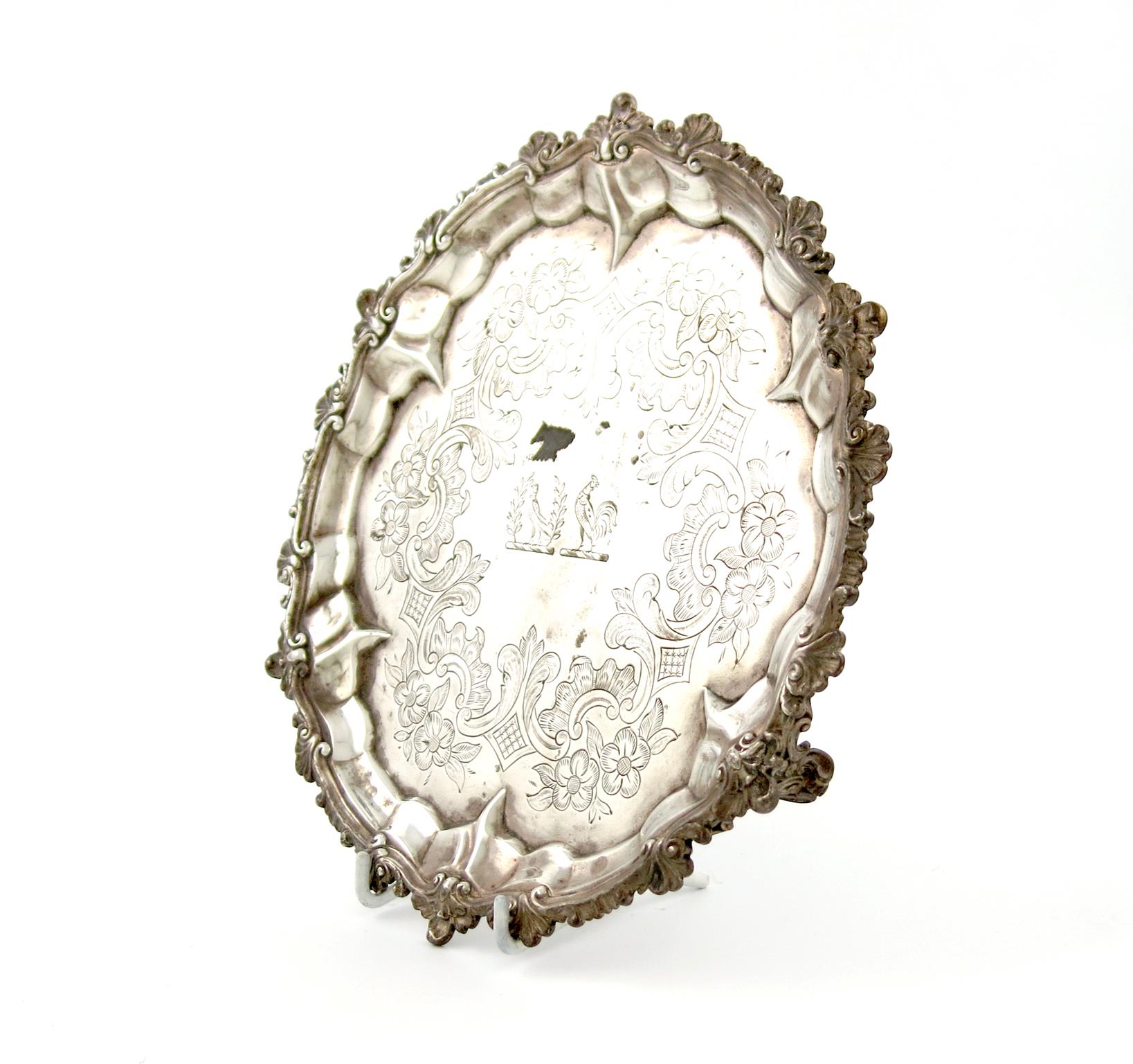 A Victorian silver salver, by D and C Houle, London 1846, circular form, shell and scroll border, the centre with chased foliate decoration, engraved with two crests, on four bracket feet, diameter 22.5cm, approx. weight 13.5oz.