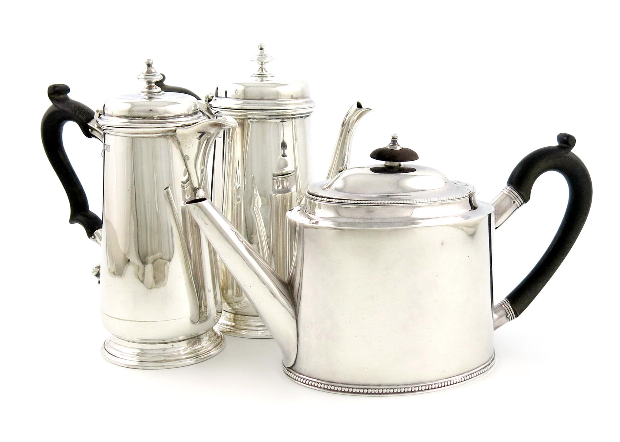 A pair of silver café au lait pots, by Holland, Aldwinckle & Slater, London 1911, tapering circular form, scroll handles, domed covers with knop finials, plus a silver teapot, by Charles Stuart Harris, London 1913, in the George II manner, beaded borders, approx. total weight 39oz. (3)