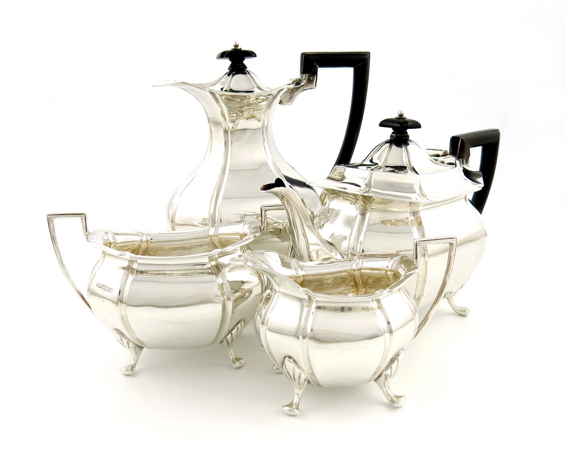 A four-piece silver tea set, by Mappin and Webb, Sheffield 1911, lobed oval baluster form, scroll handles, on four scroll feet, approx. weight 53.8oz. (4)