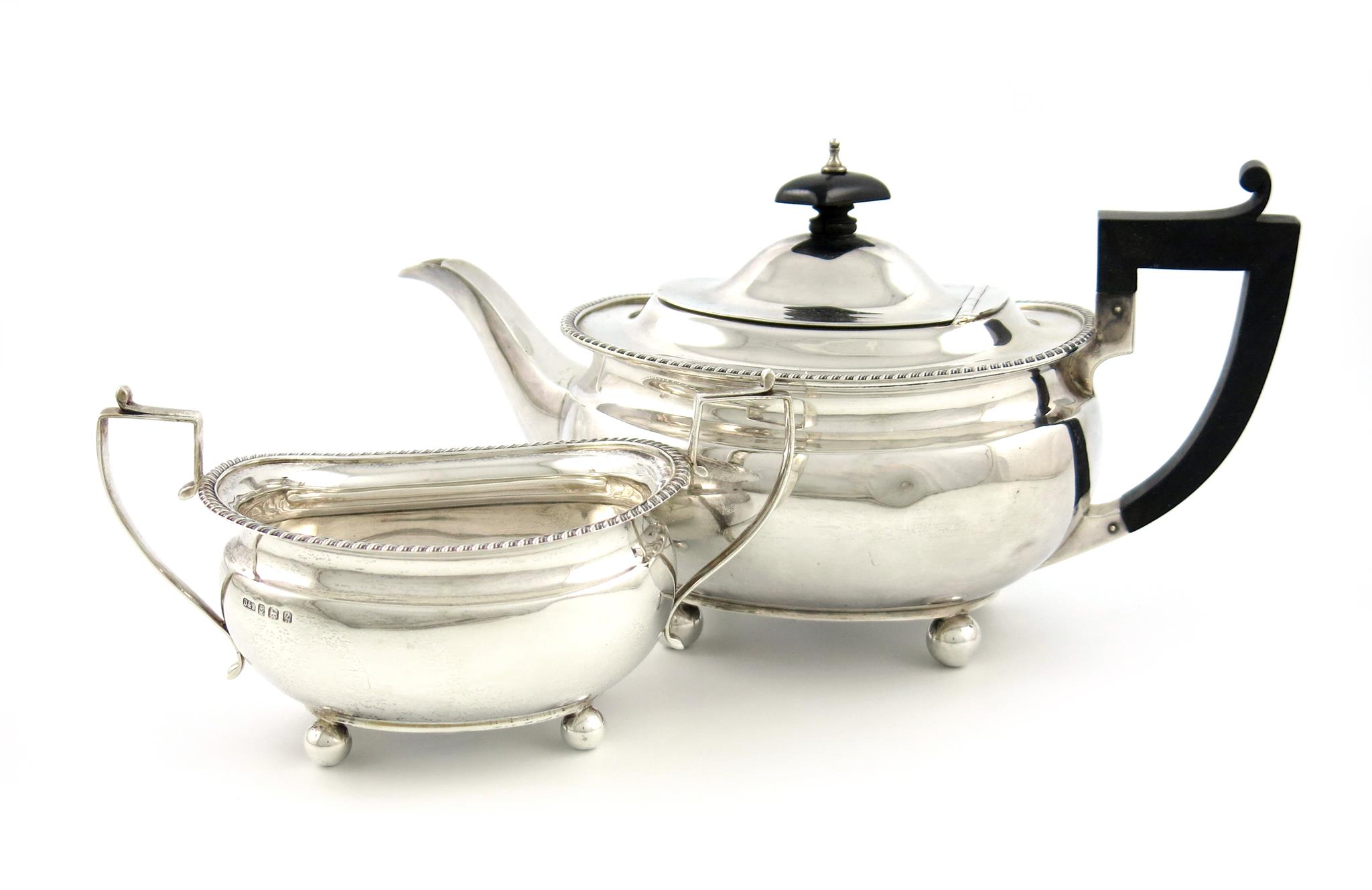 A silver teapot and sugar bowl, by Docker & Burn Ltd, Birmingham 1924 and 1928, oblong bellied form, gadroon borders, scroll handles, on four ball feet, approx. weight 30.5oz. (2)