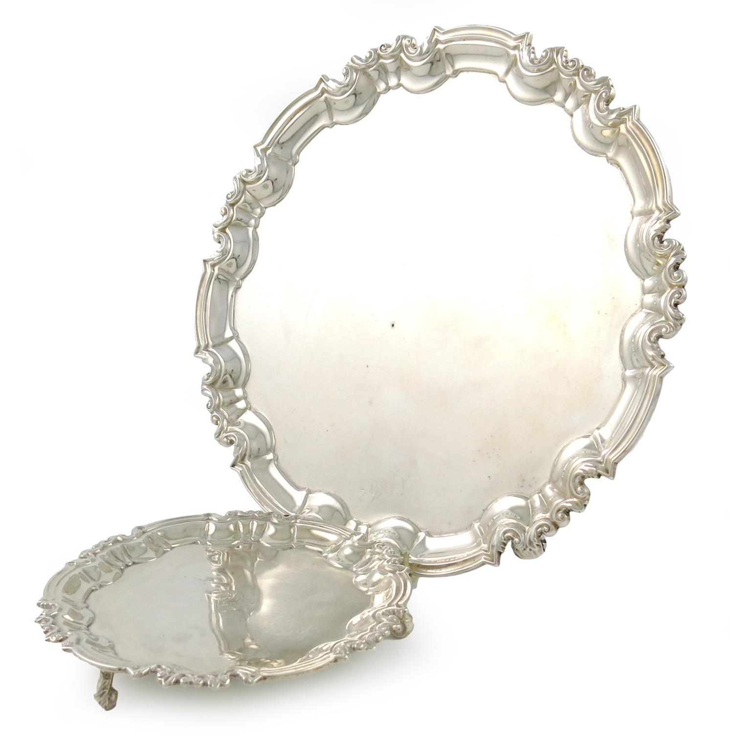 circular form, moulded border, on three gnarl feet, plus an Edwardian silver waiter, by the same maker, London 1908, circular form, moulded border, on three gnarl feet, approx. total weight 27.5oz. (2)