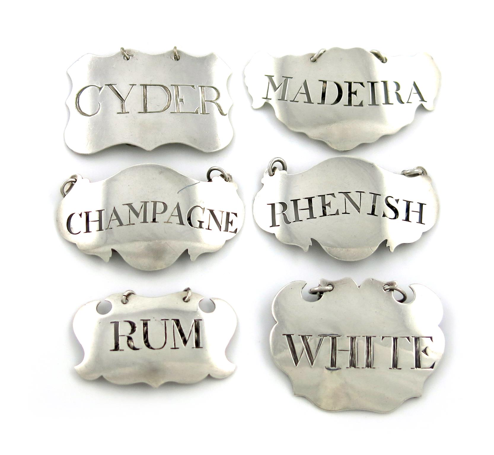 plain cartouche and shaped rectangular form, pierced and incised 'CYDER', 'RHENISH', 'CHAMPAGNE', 'WHITE', 'MADEIRA' and 'RUM', approx. weight 2.6oz. (6)