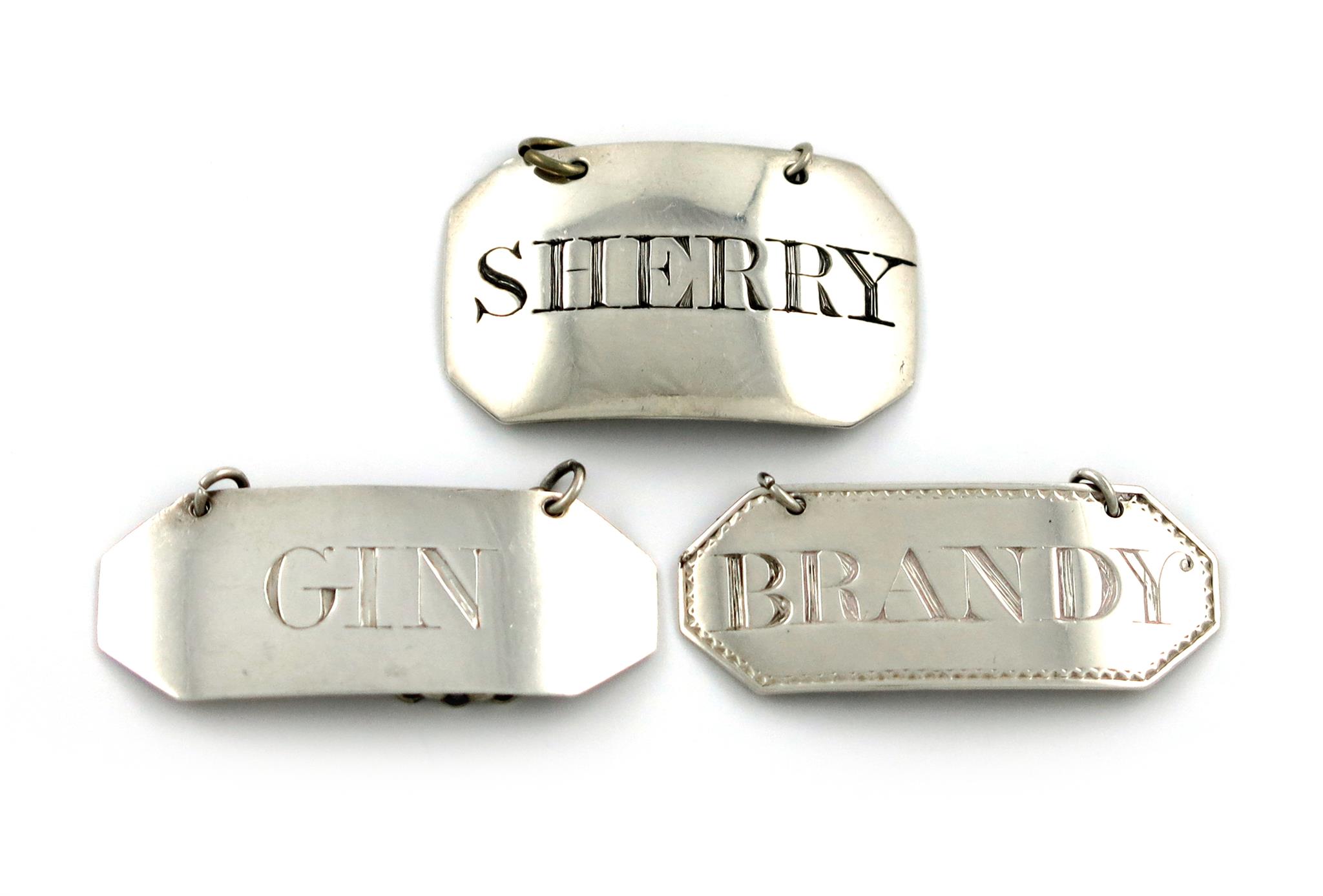 comprising: one by Hampston, Prince and Cattles, York circa 1803, rectangular form, canted corners, incised 'SHERRY', plus one by Richard Clark, York circa 1792, incised 'BRANDY' and another by the same maker, incised 'GIN', approx. weight 0.9oz. (3)