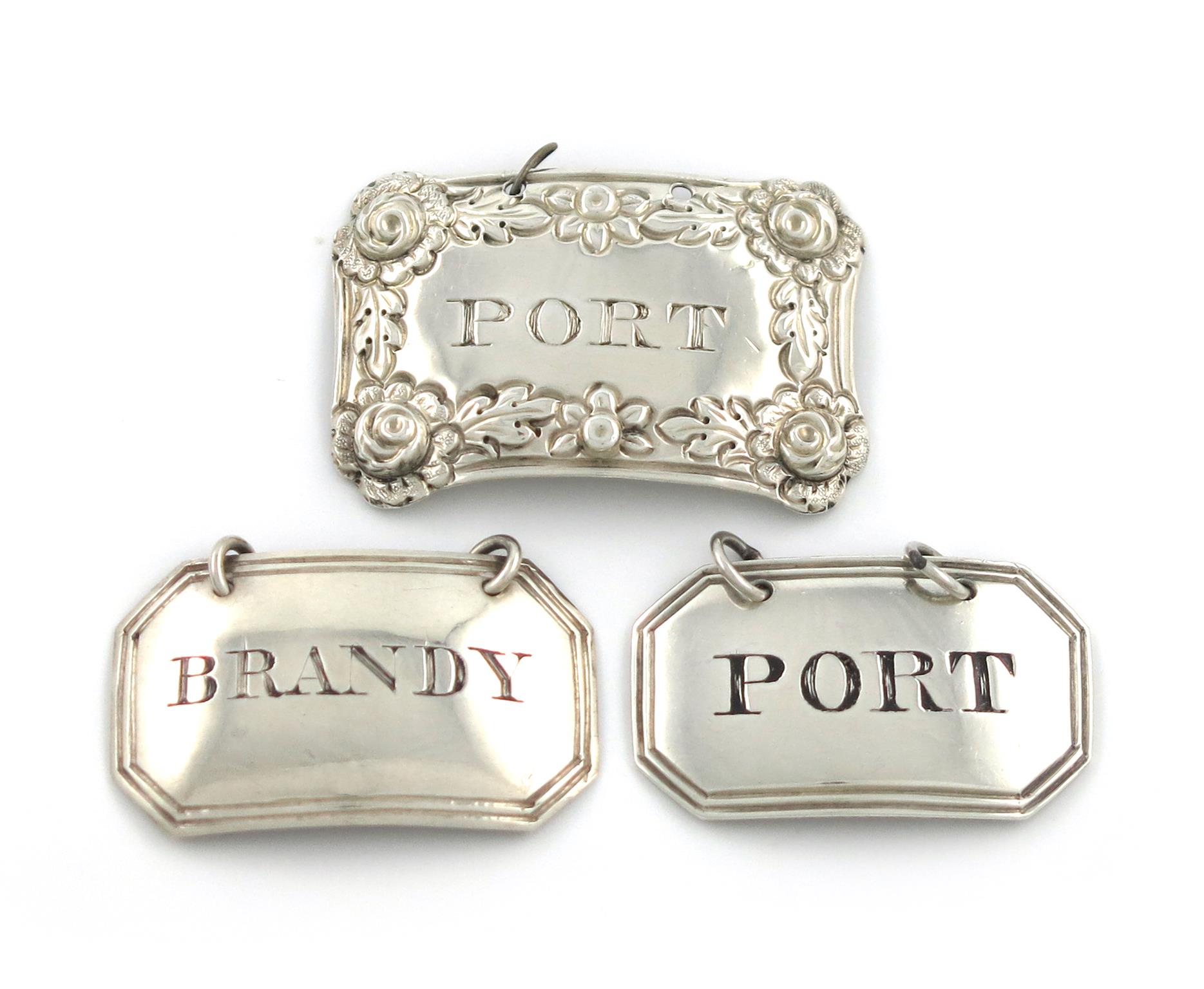 comprising: one by Barber, Cattle and North, York circa 1825, rectangular form, canted corners, incised and blackened 'PORT', plus one by John Bell, York circa 1845, incised 'BRANDY' and one by Barber and Whitwell, York circa 1820, incised 'PORT', approx. weight 0.8oz. (3)