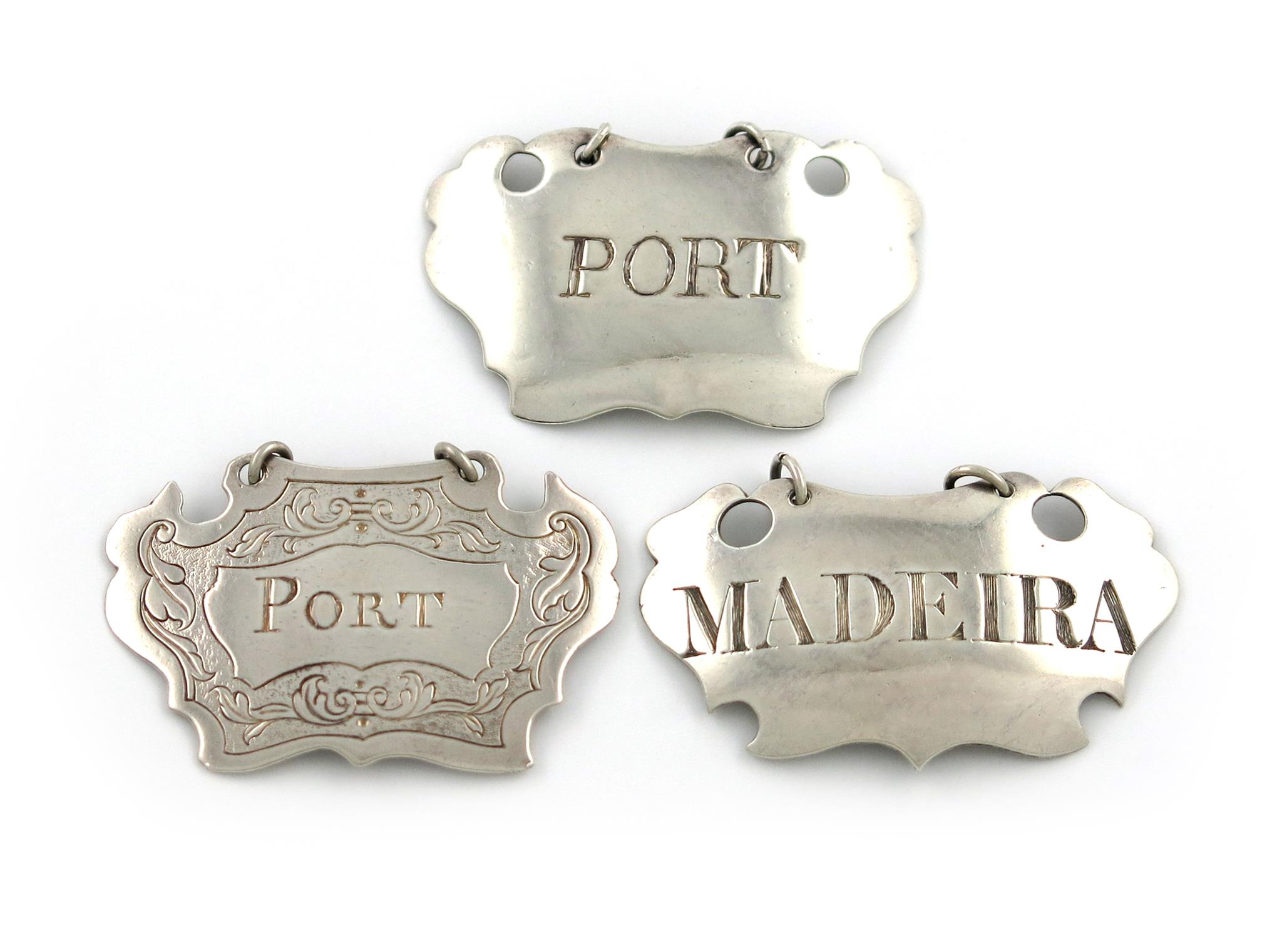 comprising a mid-18th century one by John Langlands I, Newcastle circa 1760, cartouche form, incised 'PORT', plus one by Thomas Watson, Newcastle, 1797, incised 'MADEIRA', and an unmarked label, incised 'PORT', approx. weight 1.2oz. (3)