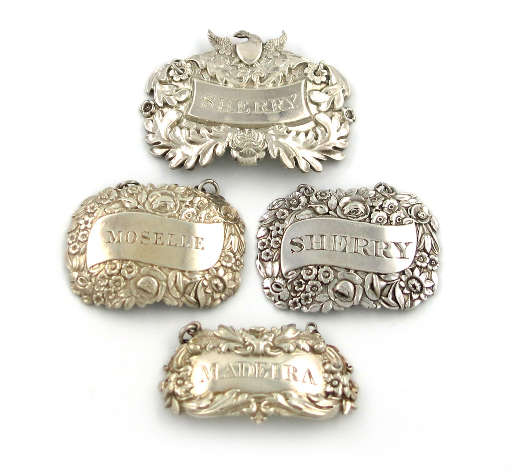 foliate borders, incised 'MOSELLE', 'SHERRY', '(x2) and 'MADEIRA', approx. weight 1.8oz. (4)