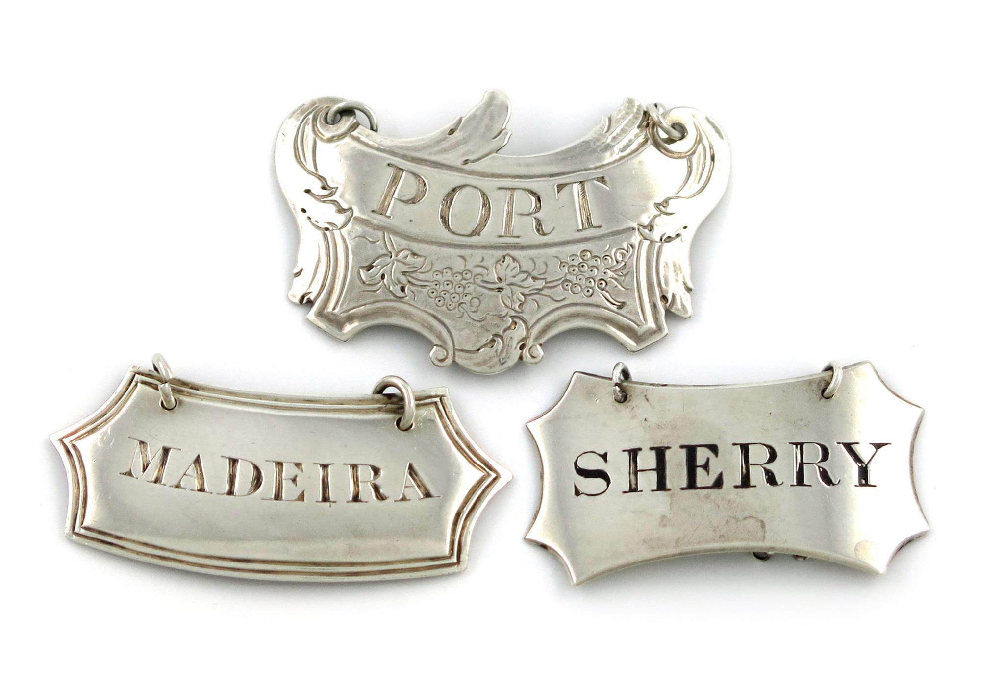 comprising: an 18th century one of cartouche form, by John Langlands and John Goodrick, Newcastle circa 1755, incised 'PORT', one by Thomas Watson, Newcastle circa 1805, incised and blackened 'SHERRY', one by George Lewis and John Wright, Newcastle circa 1815, incised 'MADEIRA', approx. weight 1.2oz. (3)
