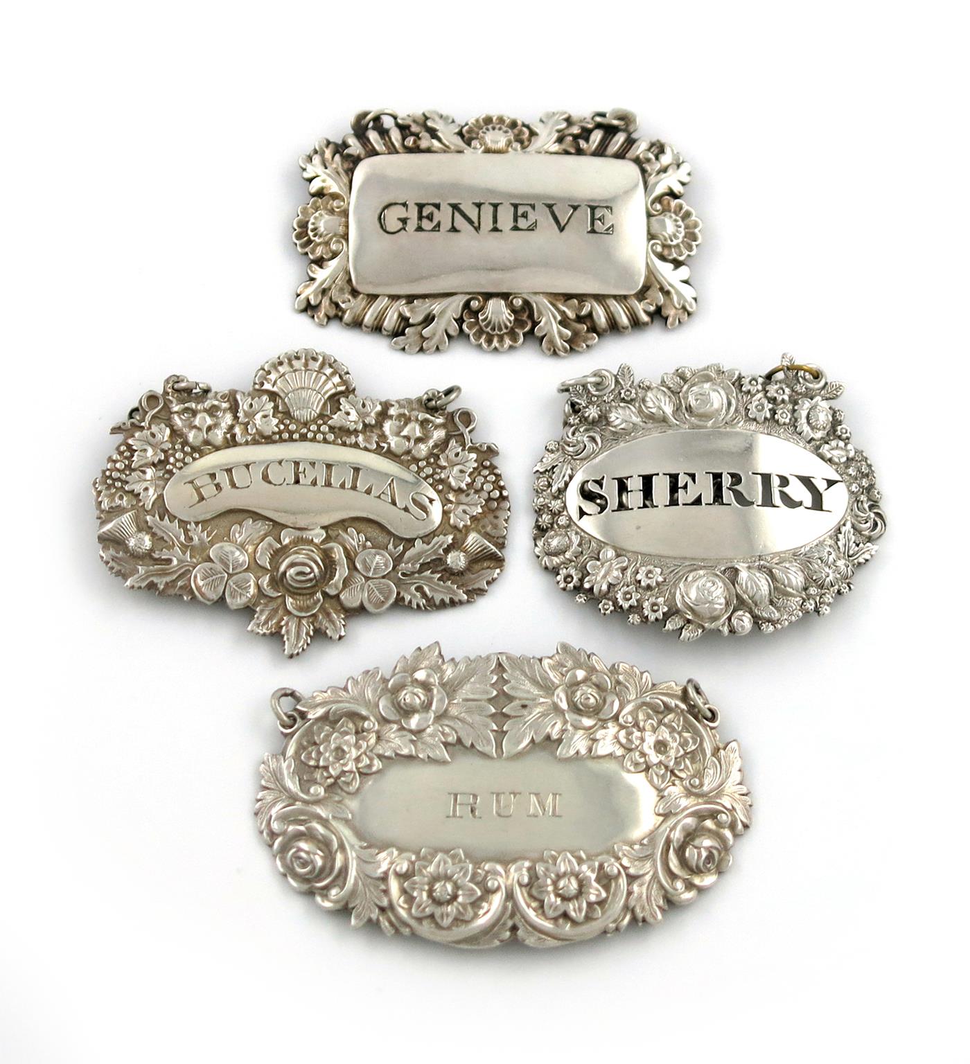 foliate, shell and gadroon borders, incised 'GENIEVE', 'BUCELLAS', 'SHERRY' and 'RUM', approx. weight 2.2oz.