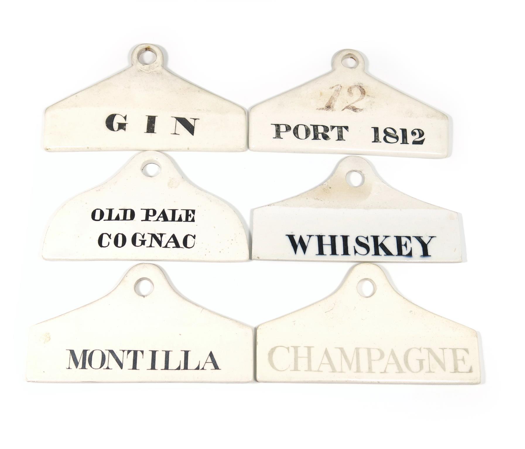 arched rectangular form, titled in black 'OLD PALE COGNAC', 'MONTILLA', 'WHISKEY', 'CHAMPAGNE', 'PORT 1812', and 'GIN'. (6)