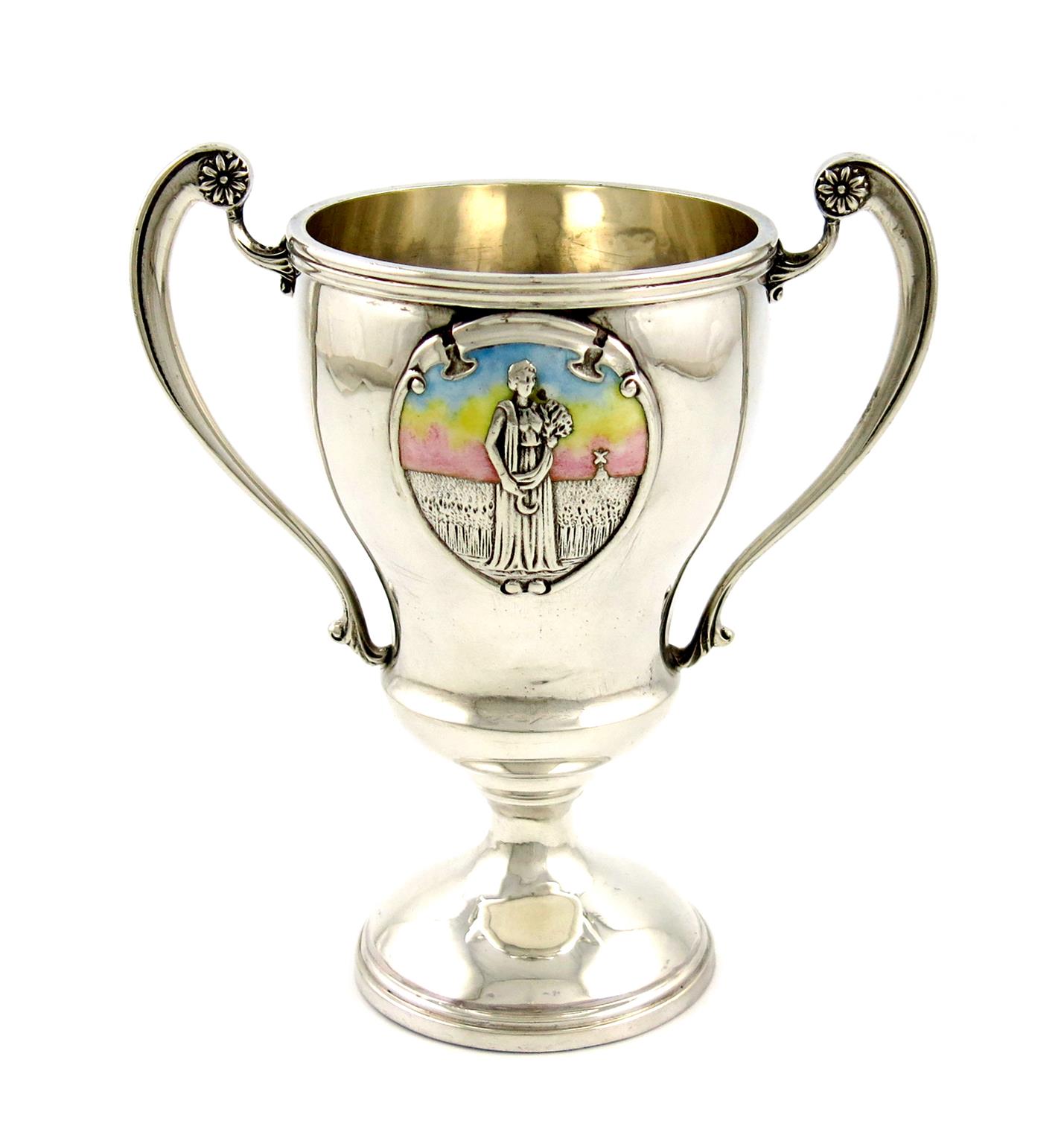 A two-handled silver and enamel cup,