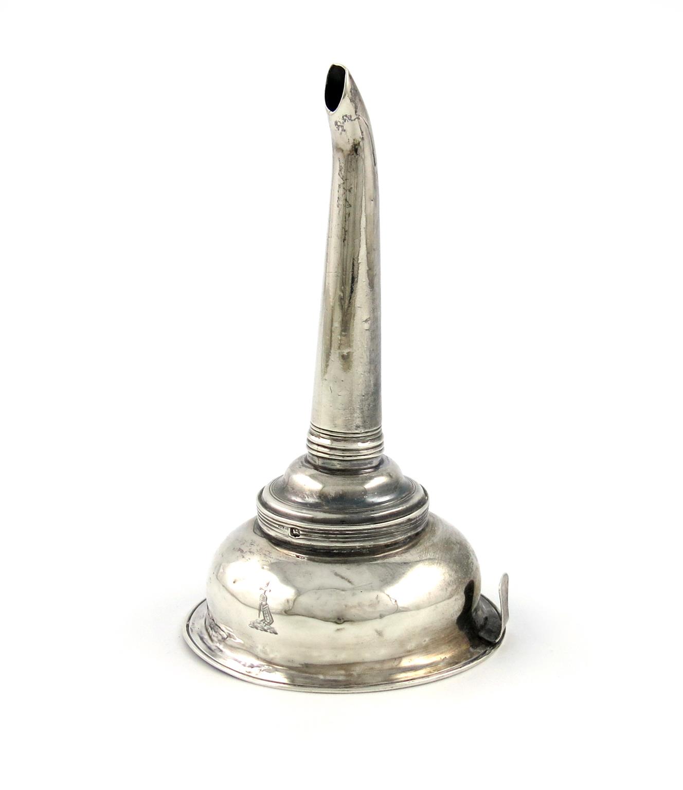 A George III silver wine funnel, by Urquhart and Hart, London 1802, circular form, with a side clip and reeded border, engraved with a crest, length 14.2cm, approx. weight 2.1oz.
