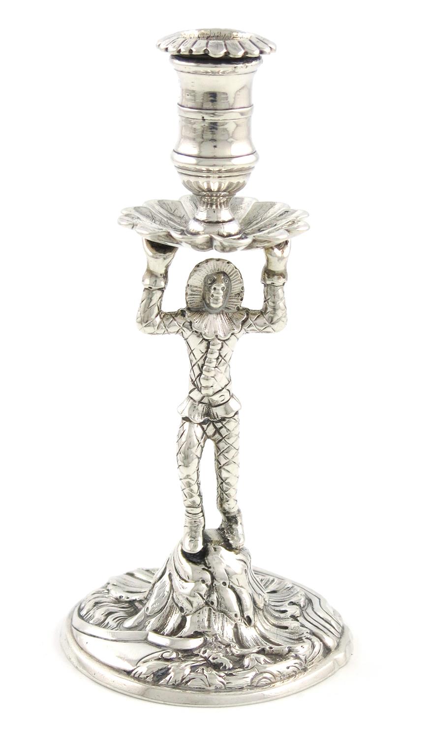 modelled in a standing position, with arms raised holding a fluted drip pan, spool shaped capital, on a raised circular base, height 14.5cm, approx. weight 6oz.