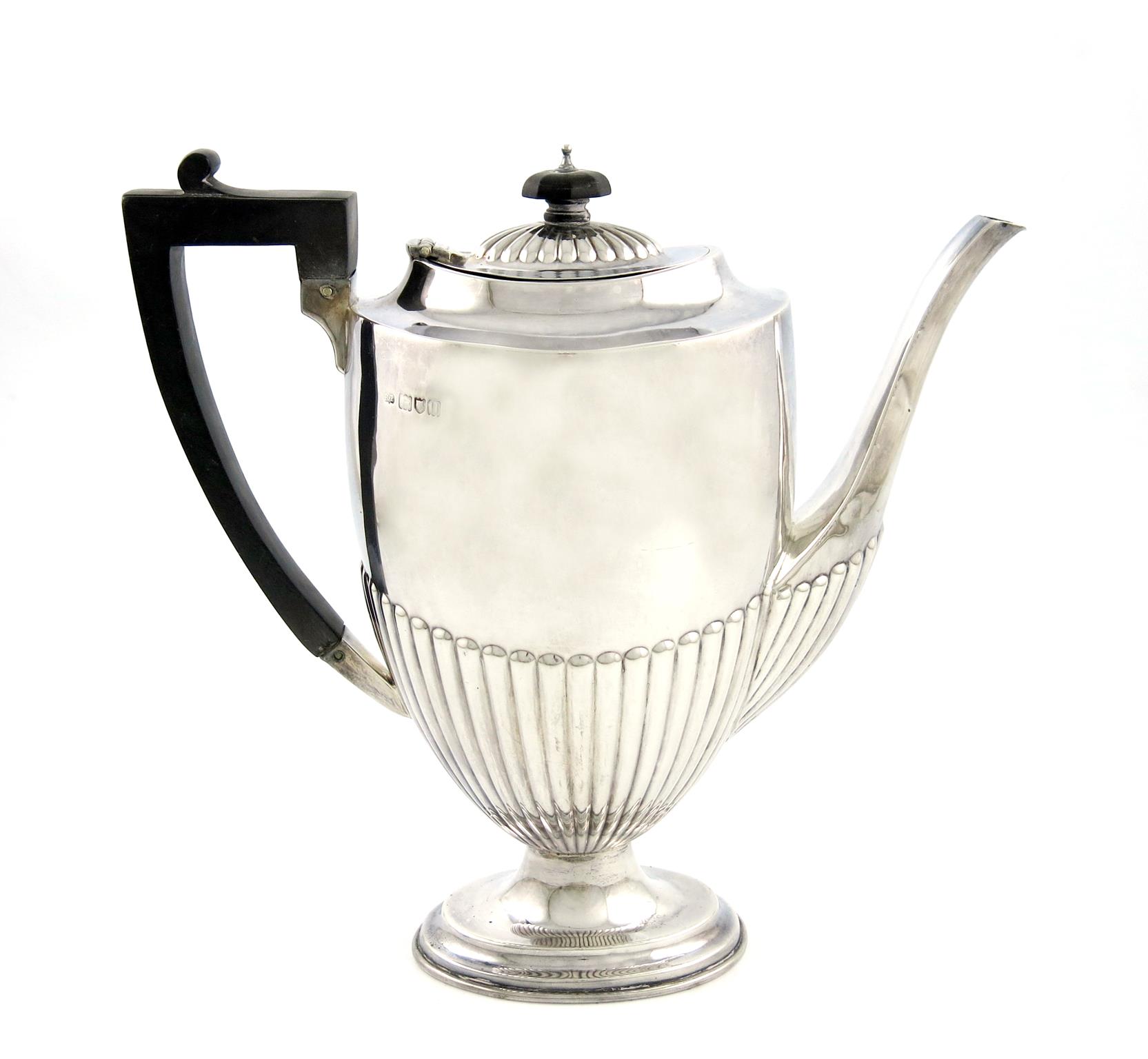 A Victorian silver coffee pot, by R. Pringle, London 1915, tapering oval form, part-fluted decoration, scroll handle, on a raised oval foot, height 26cm, approx. weight 21oz.