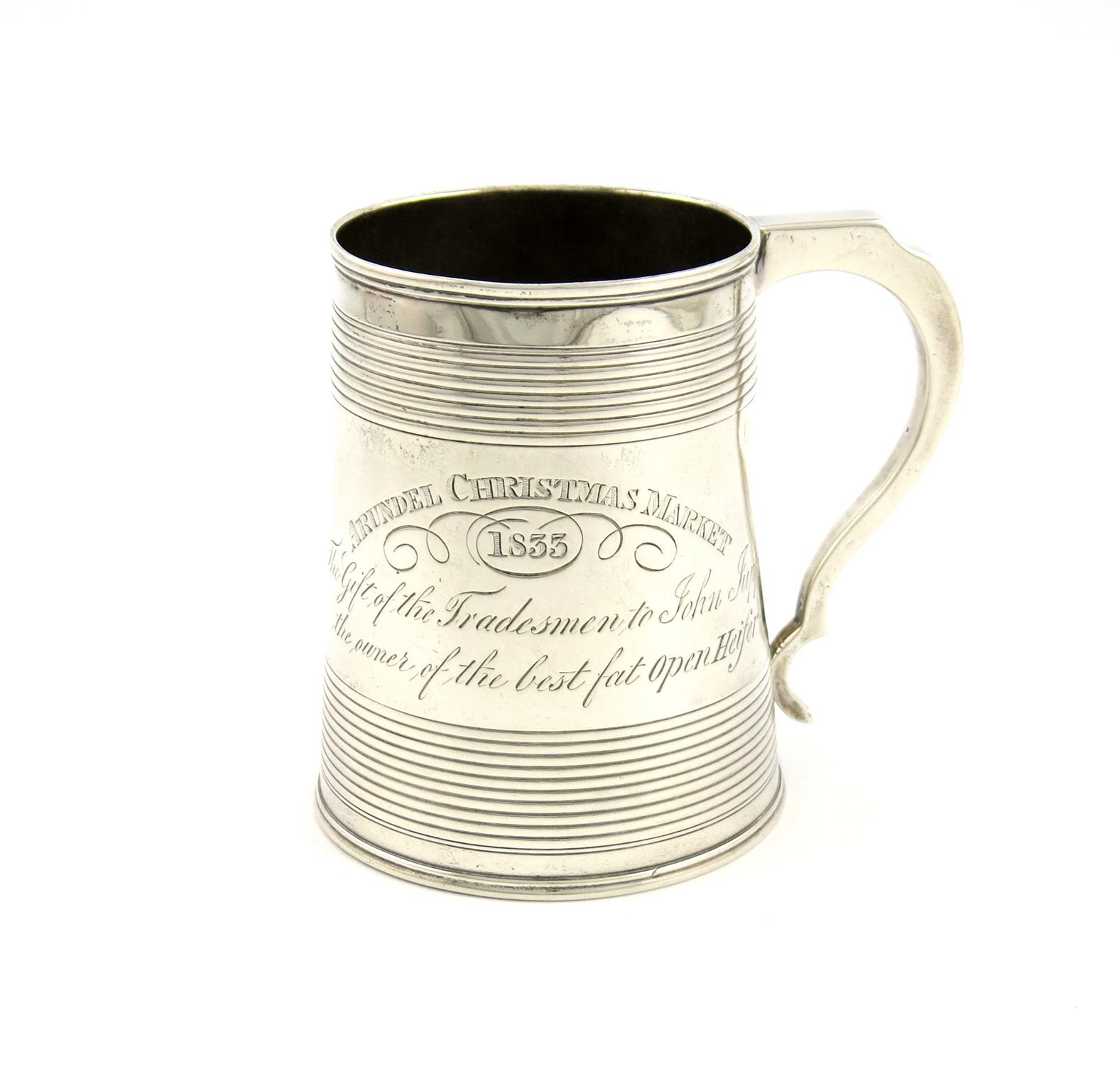 tapering circular form, scroll handle, with an upper and lower band of reeded decoration, engraved with the crest of a bird and inscribed 'Arundel Christmas Market, 1833, The Gift of the Tradesmen to John Jupp, the Owner of the Best Fat Open Heifer', height 11cm, approx. weight 8.3oz.