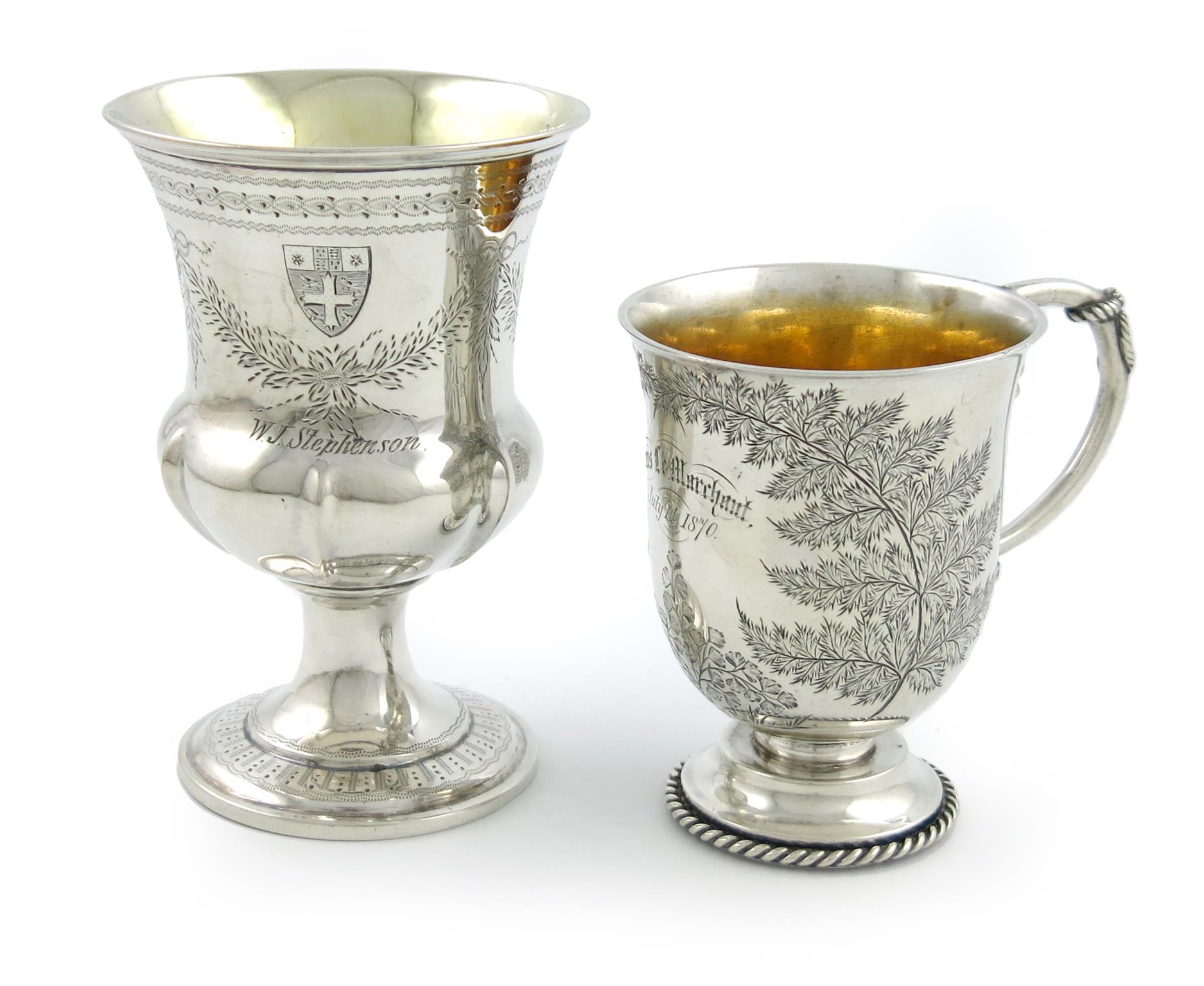circular form, with engraved fern decoration, the scroll handle with rope-work mounts and on a raised circular foot with a rope-work border, inscribed, plus Victorian silver goblet, probably London 1842, engraved decoration, approx. weight 8.6oz. (2)