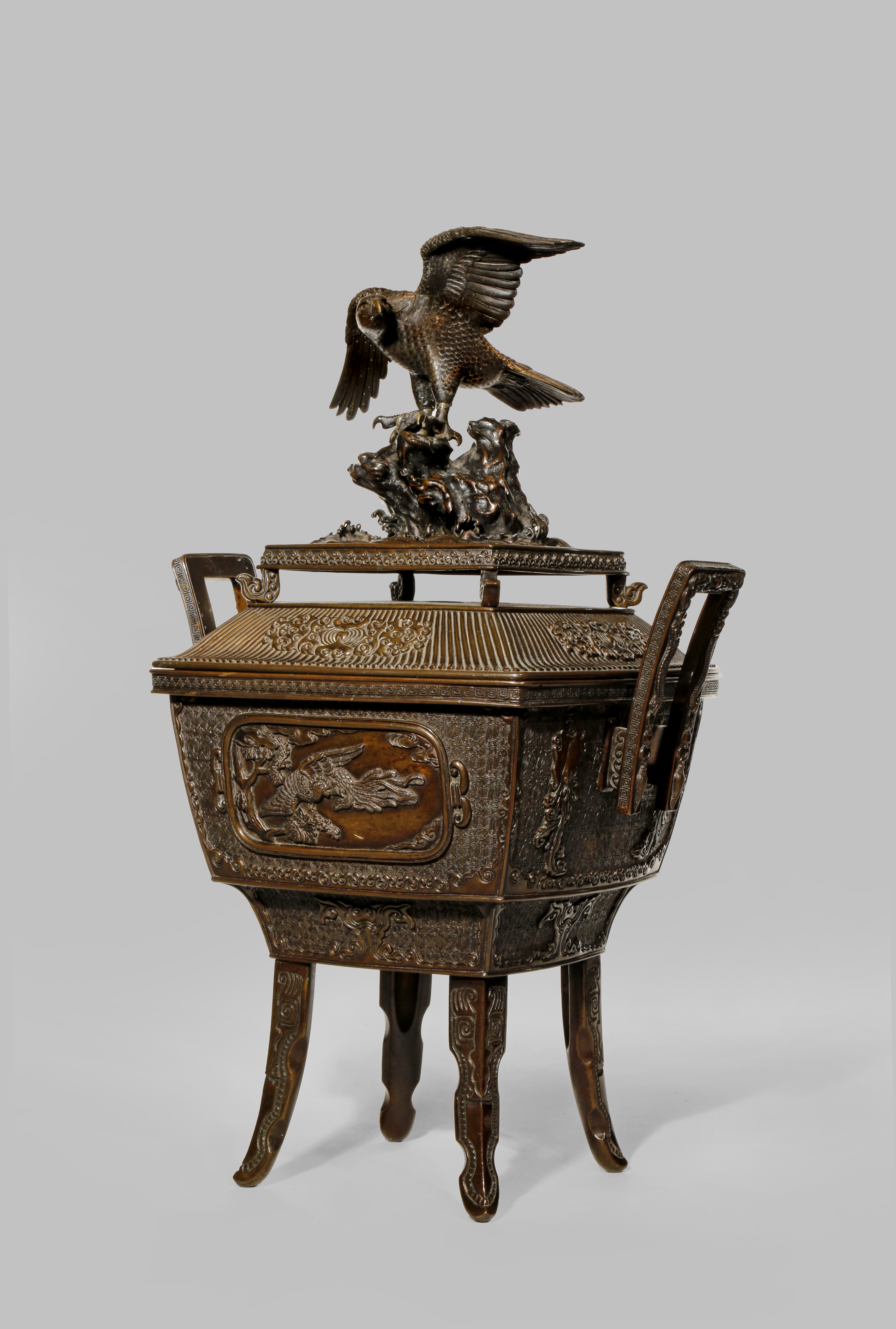 The square-section body with two loop handles and raised on four tall legs, decorated with panels containing a ho-ho bird on one side and a shishi on the other, with further stylised birds on a leiwen ground, the lid topped with an eagle with its wings outstretched, the base signed Dai Nippon Kandagawa atari no ju Shokaken kore o iru with kao, 47cm. (2)