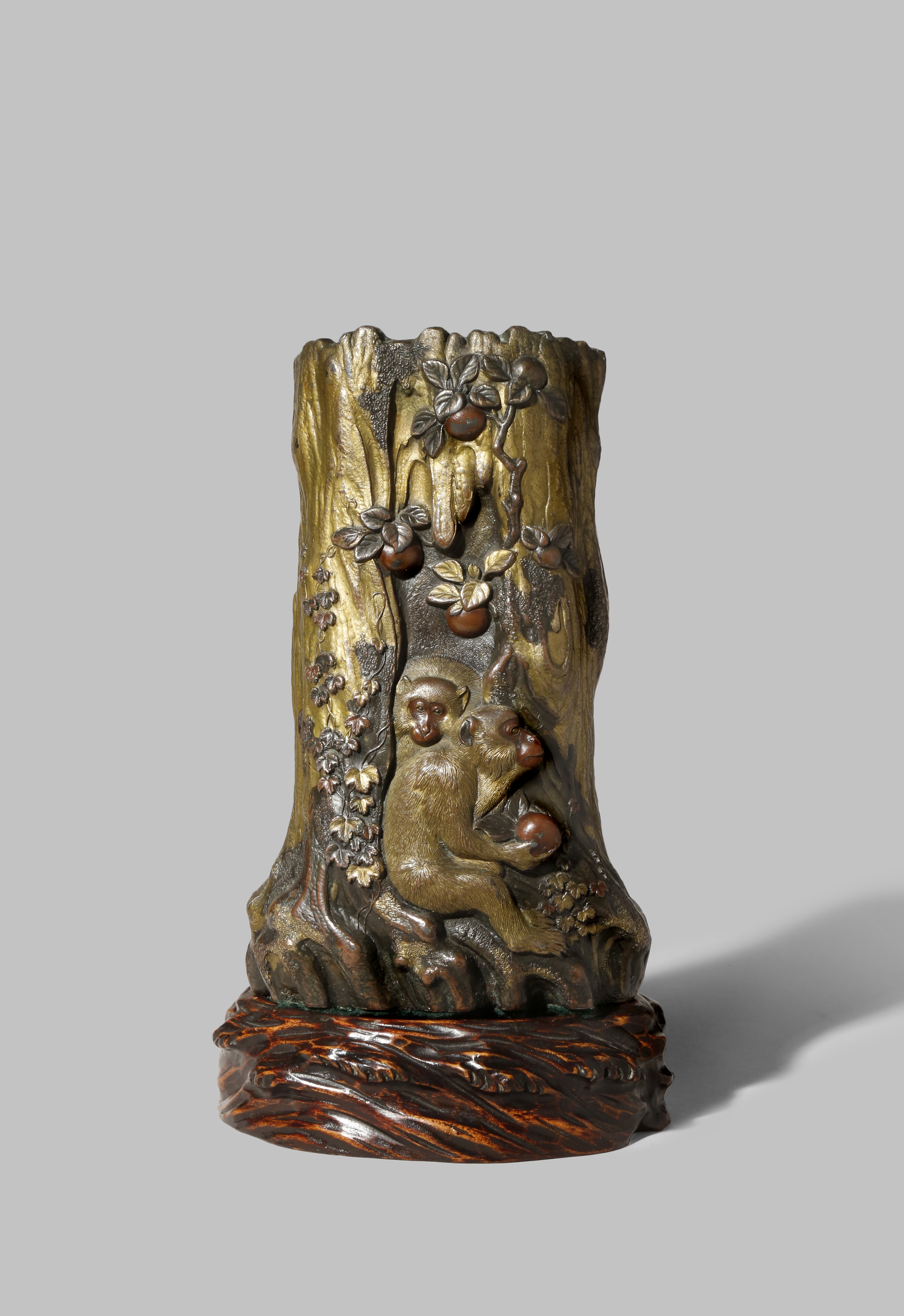 A JAPANESE MIXED METAL VASE MEIJI 1868-1912 Depicting three monkeys against a hollowed tree trunk