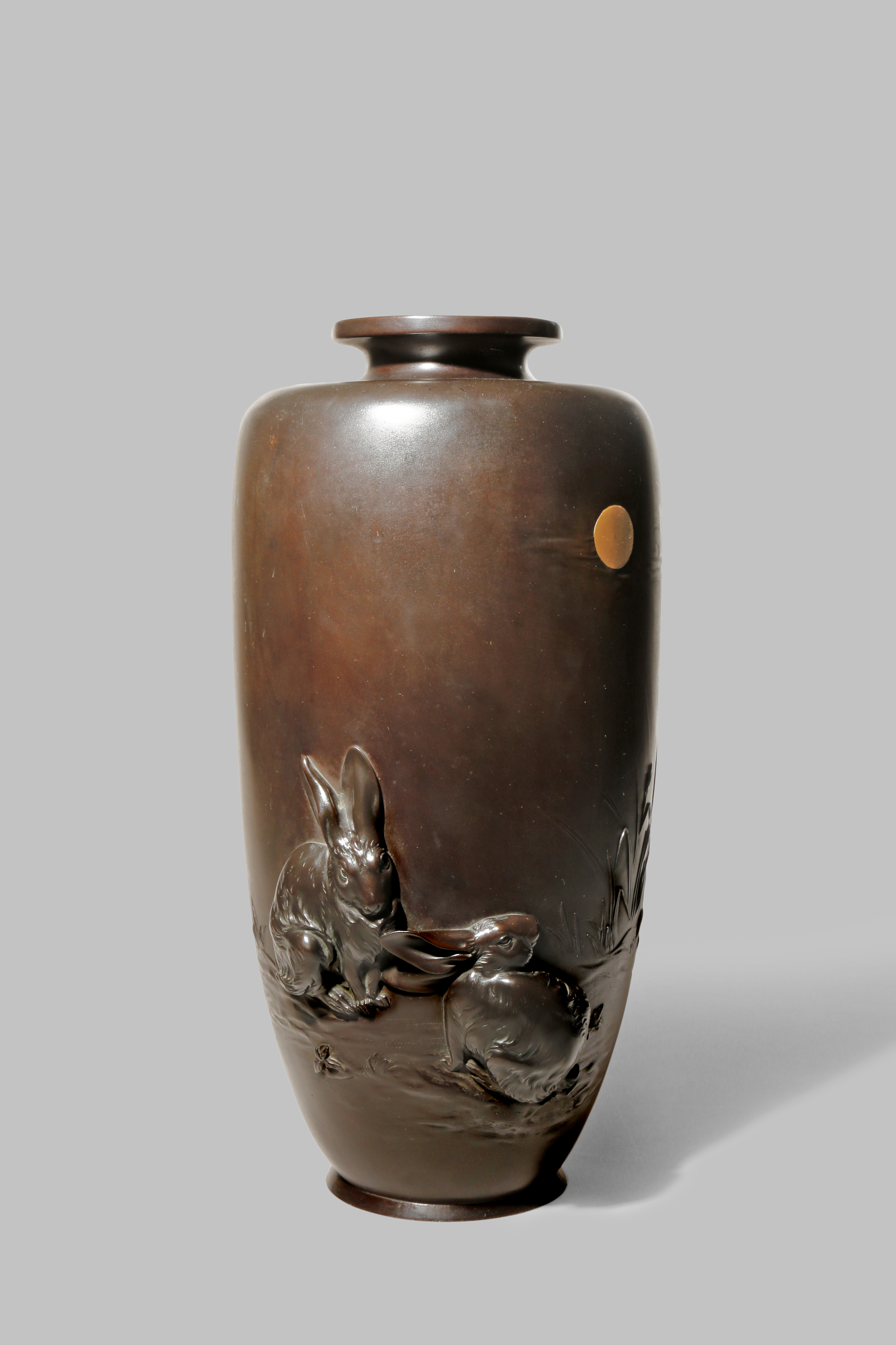 The body rising to a flared rim, decorated in low and high relief with two rabbits amongst tall grasses gazing at the moon, the celestial body inlaid in gilt bronze, the base with a four character seal mark, 40cm.
