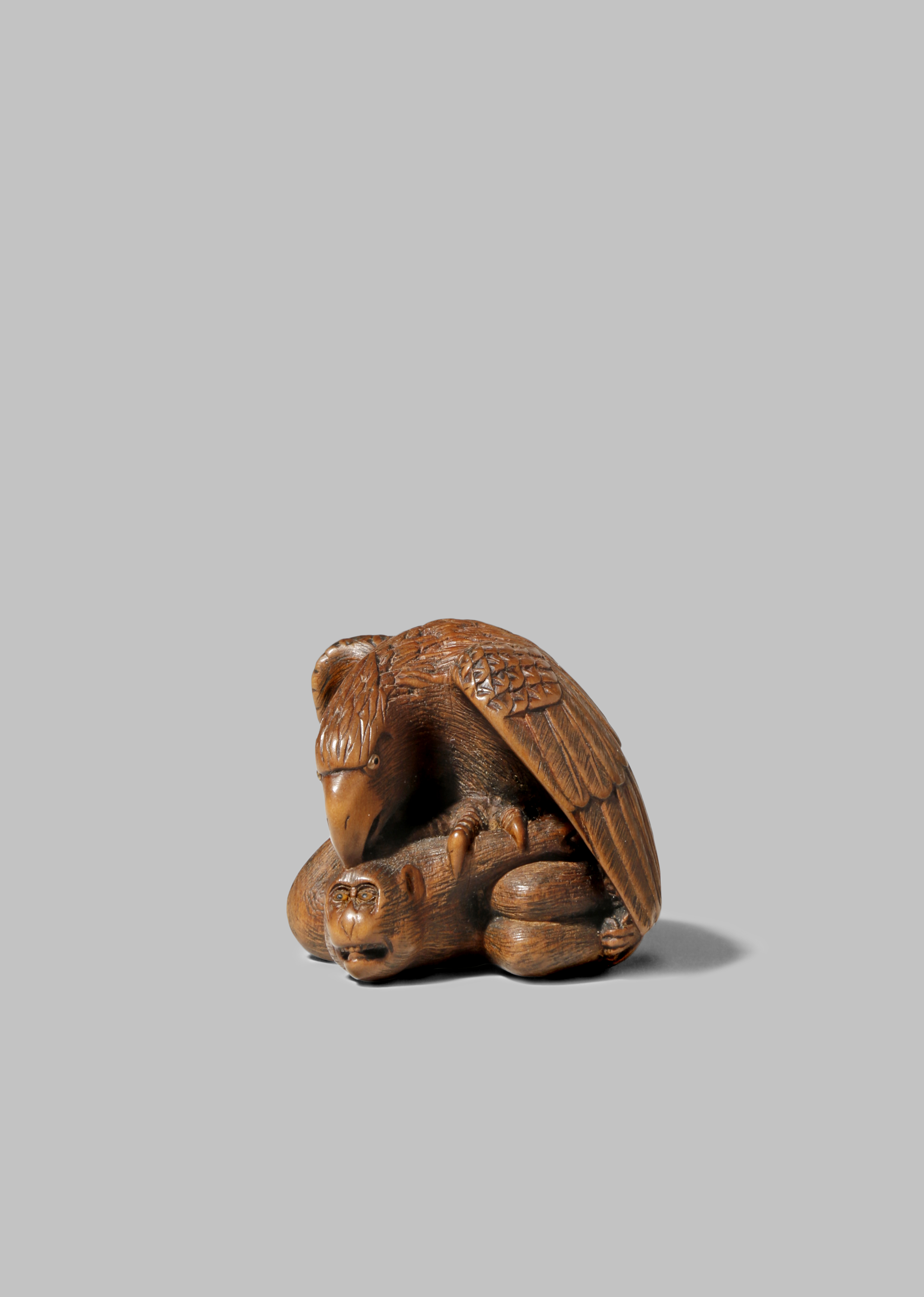 Depicting an eagle attacking a monkey, the raptor holding its terrified prey in its claws, the feathers and hair finely carved and with the eyes inlaid in horn, signed Nobukazu, together with a copy of Barry Davies Oriental Art, 100 Selected Pieces from The Netsuke Collection of Scott Meredith where this very piece is illustrated, 4.3cm. (2)
