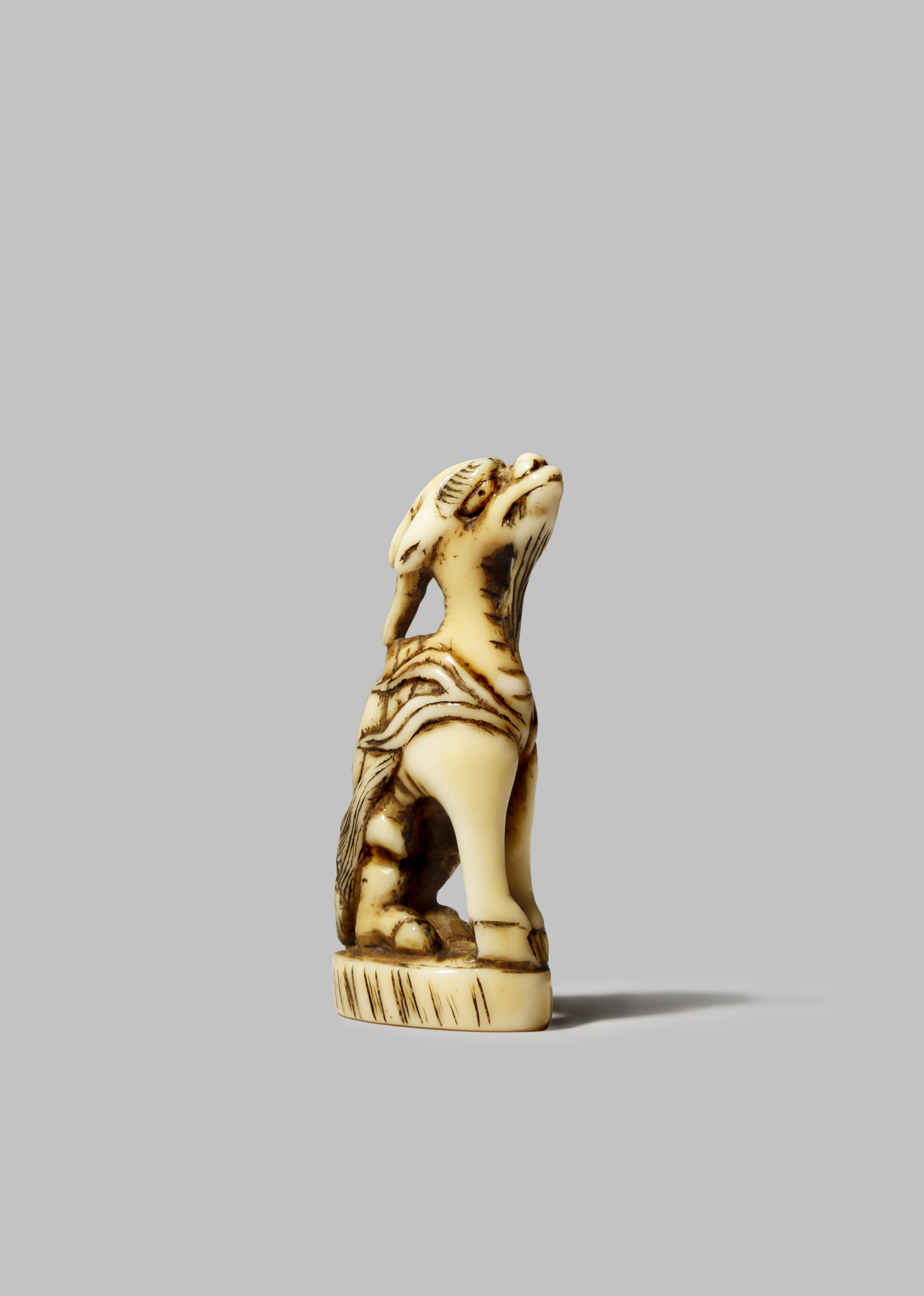 A JAPANESE NARWHAL TUSK NETSUKE MEIJI 1868-1912 Depicting a slender kirin on a base