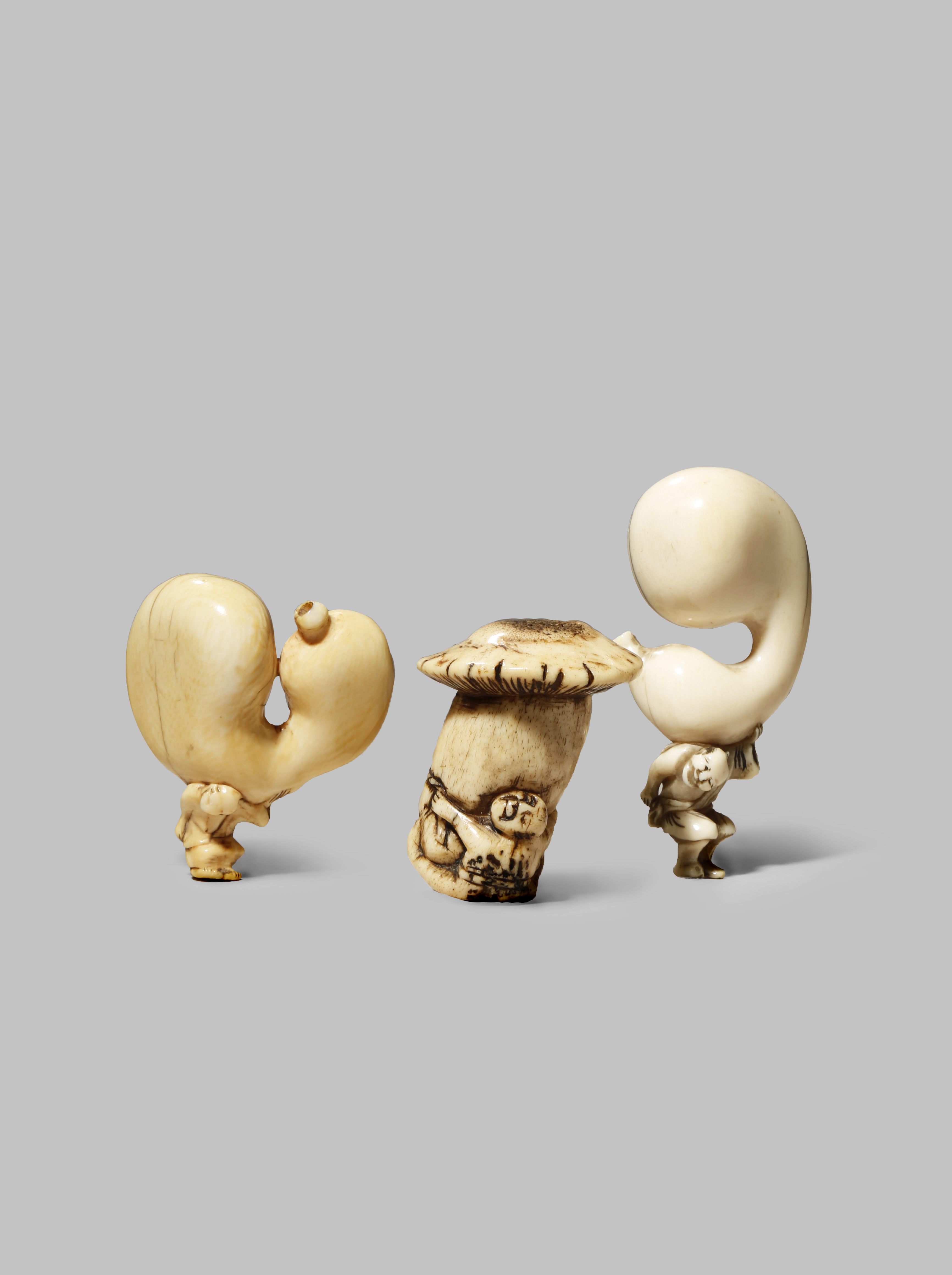 Two in ivory, both depicting a small man carrying a massive double gourd, the third stag antler, carved as a man hugging a giant mushroom, all unsigned, 6.4cm max. (3)