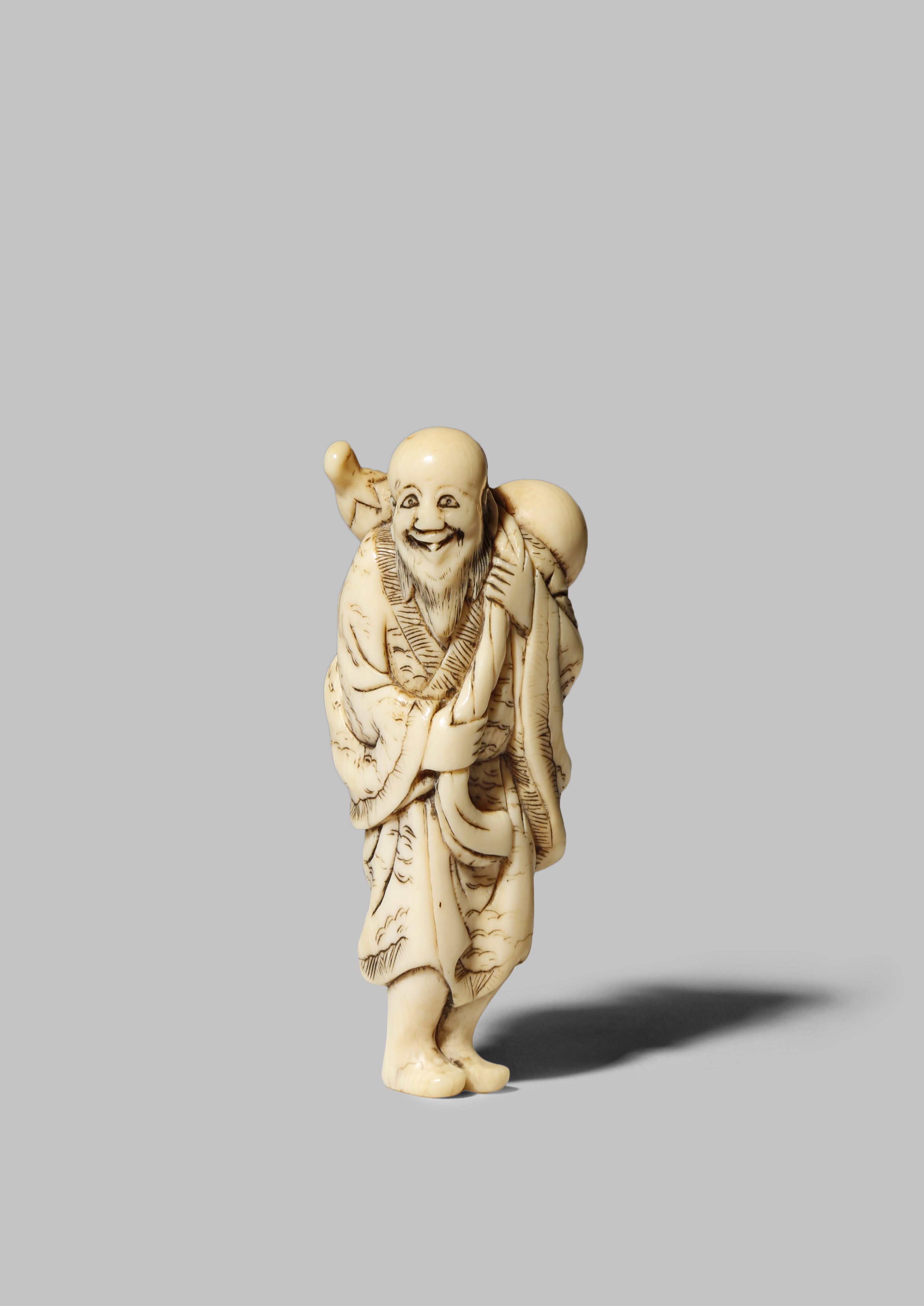 A JAPANESE IVORY NETSUKE EDO 1615-1868 Depicting Chokaro Sennin wearing long robes decorated with...