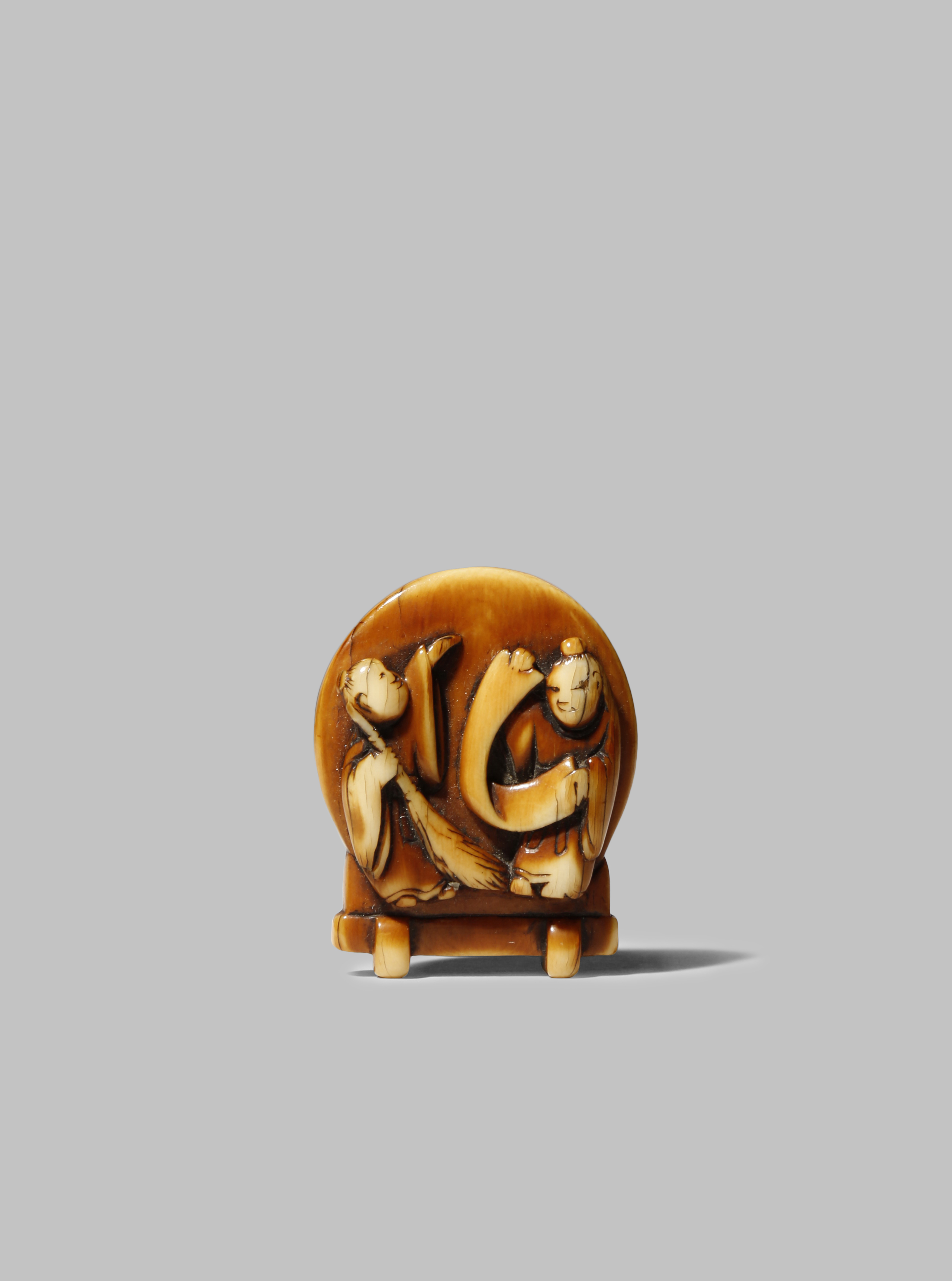 AN UNUSUAL JAPANESE IVORY NETSUKE EDO 1615-1868 Carved as a tsuitate screen decorated with Kanzan...