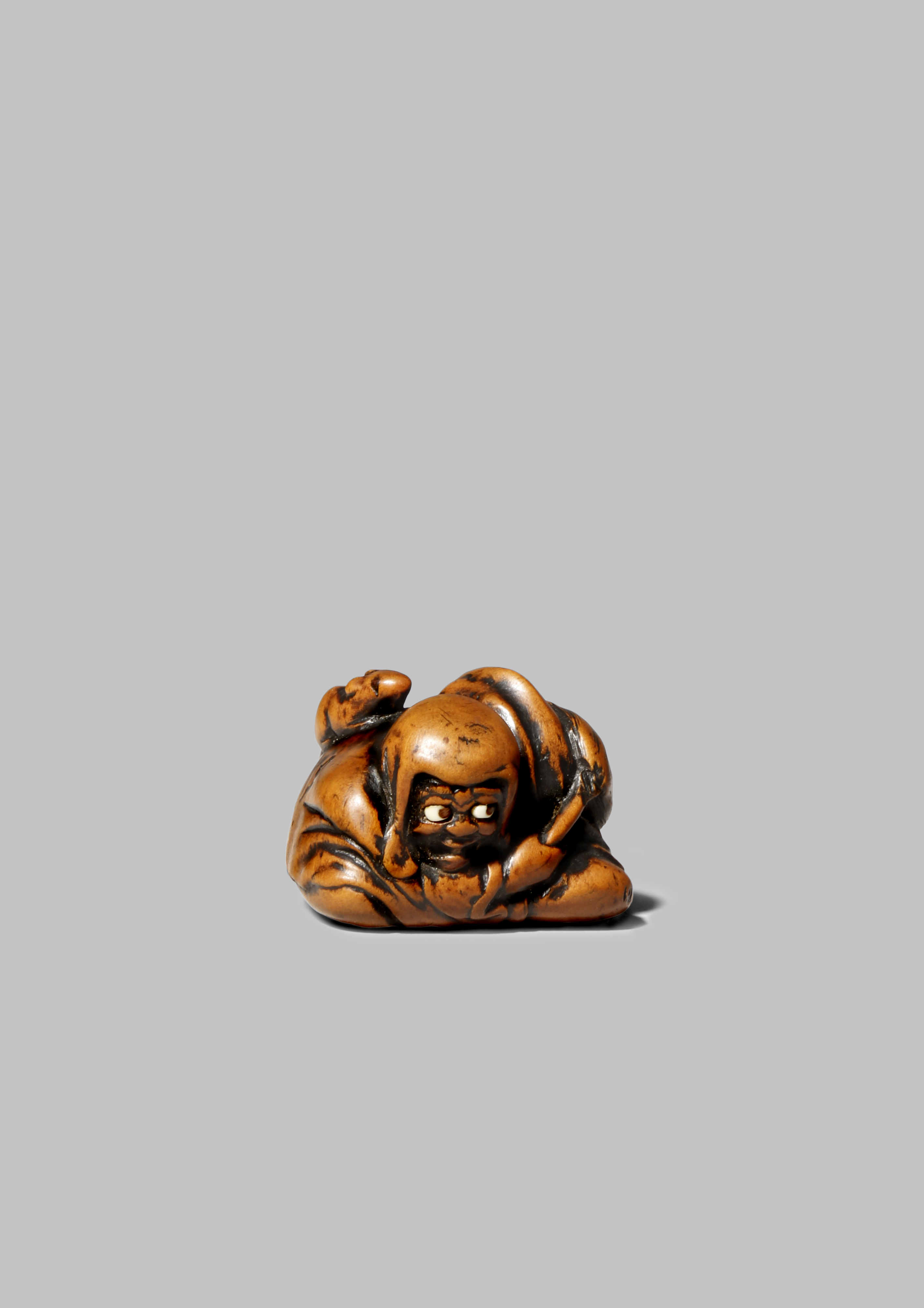 A JAPANESE WOOD NETSUKE MEIJI 1868-1912 Humorously depicting Daruma chasing a rat running on his...