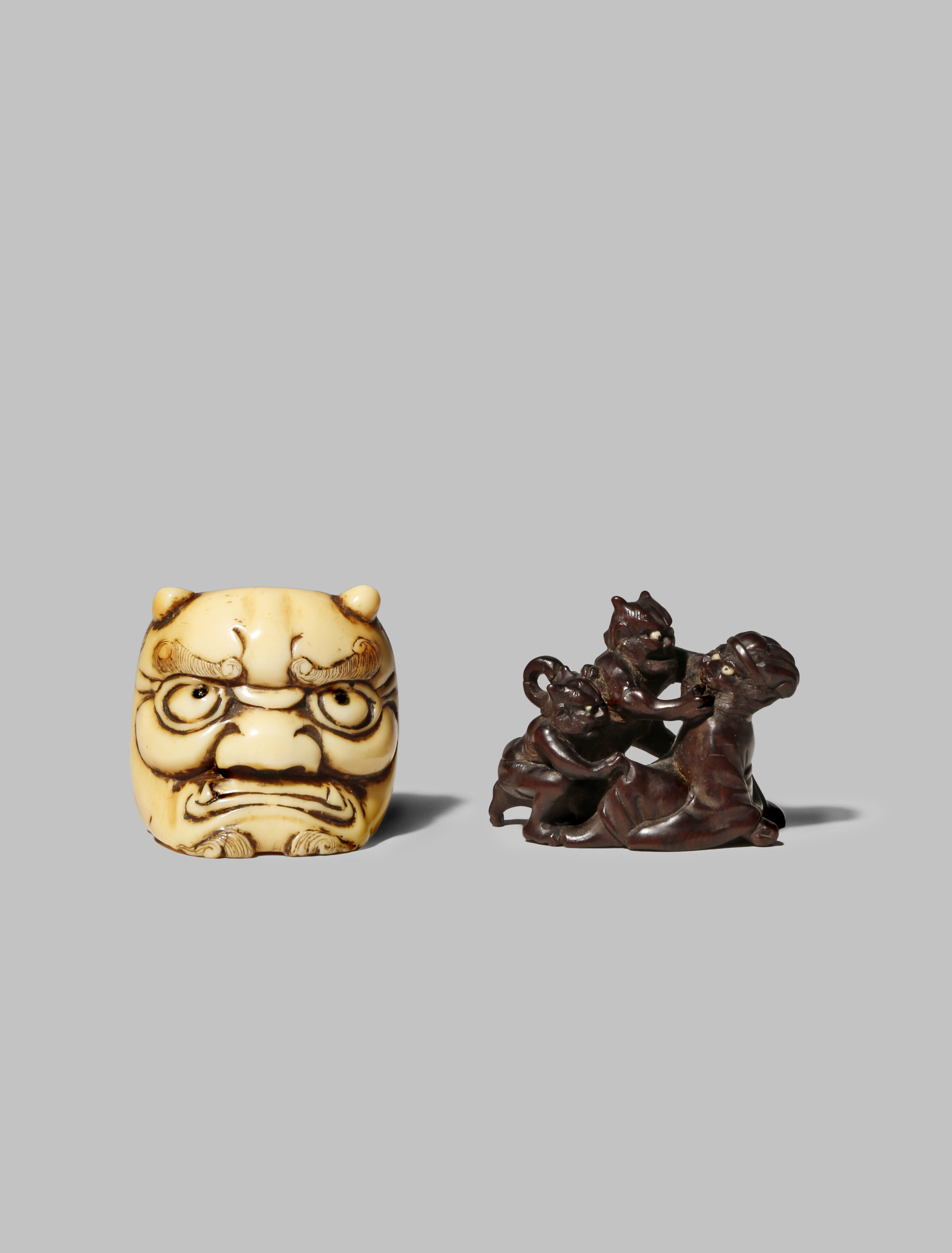 TWO JAPANESE NETSUKE MEIJI 1868-1912 One in ivory depicting a large oni mask on one side and...