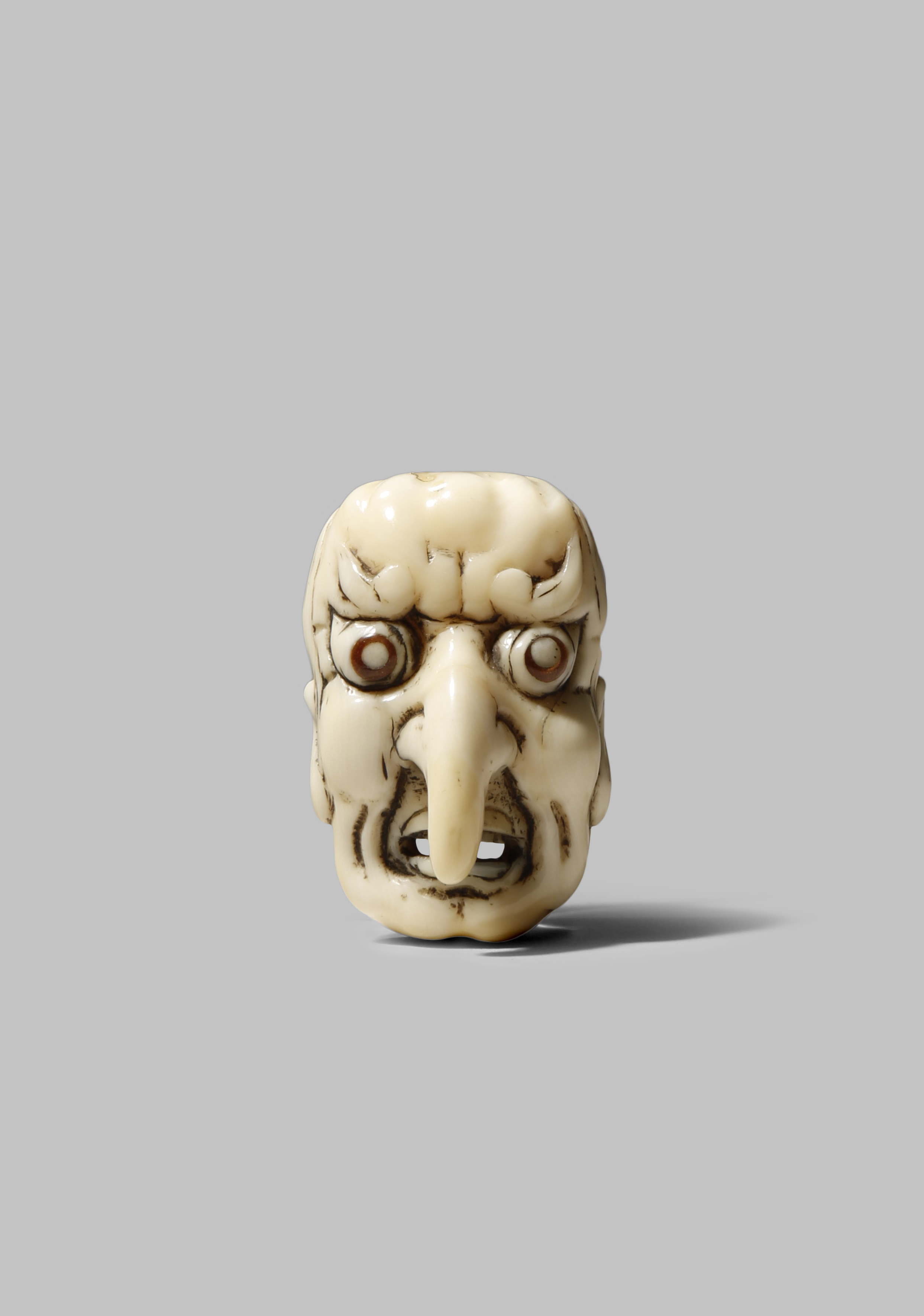 A JAPANESE IVORY NETSUKE MEIJI 1868-1912 Carved as a grimacing tengu mask with a crooked nose