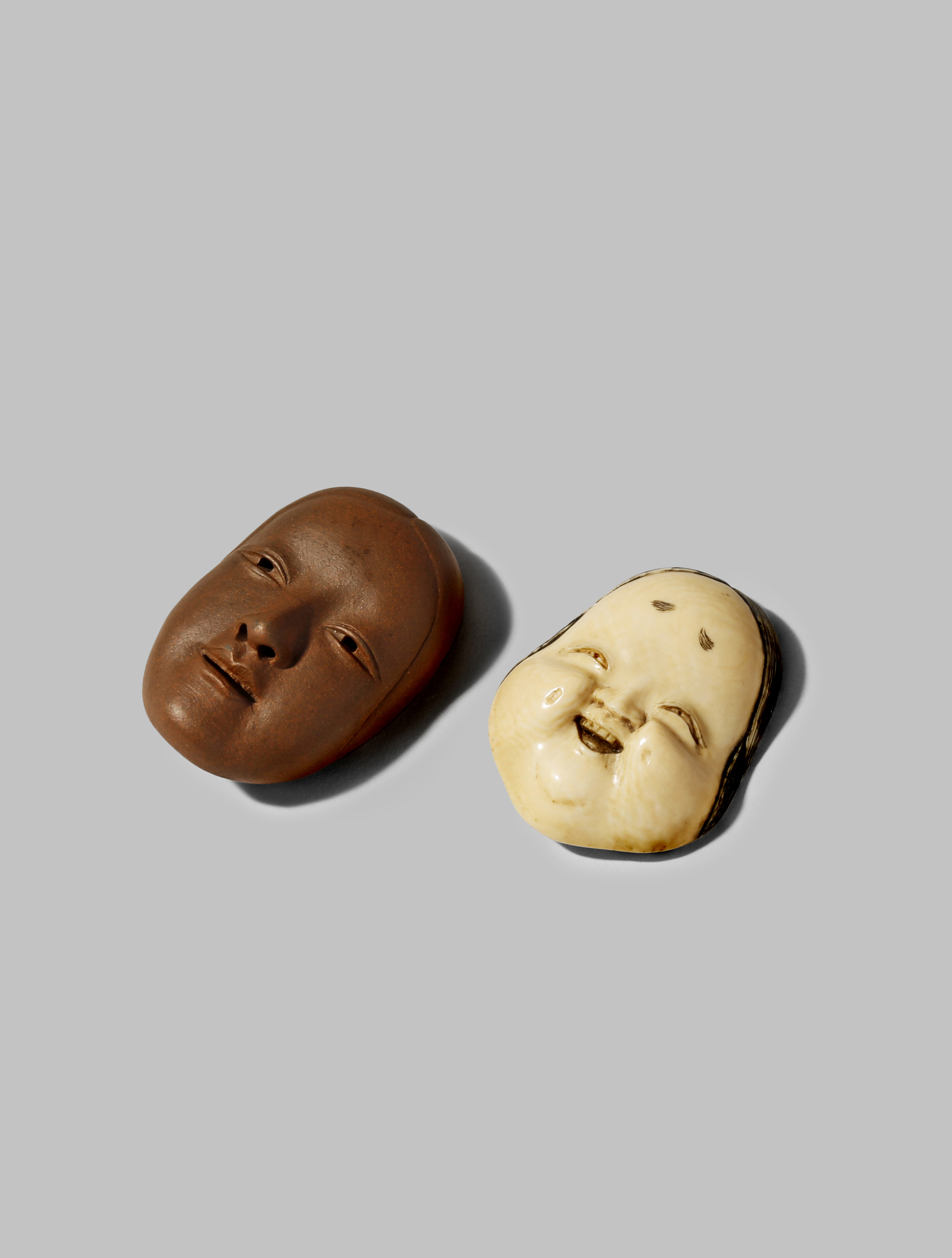 One in ivory and carved as a smiling Okame, signed Ikko, the other Bizen stoneware and depicting Ko-omote, signed Sekisen, 4.7cm max. (2)
