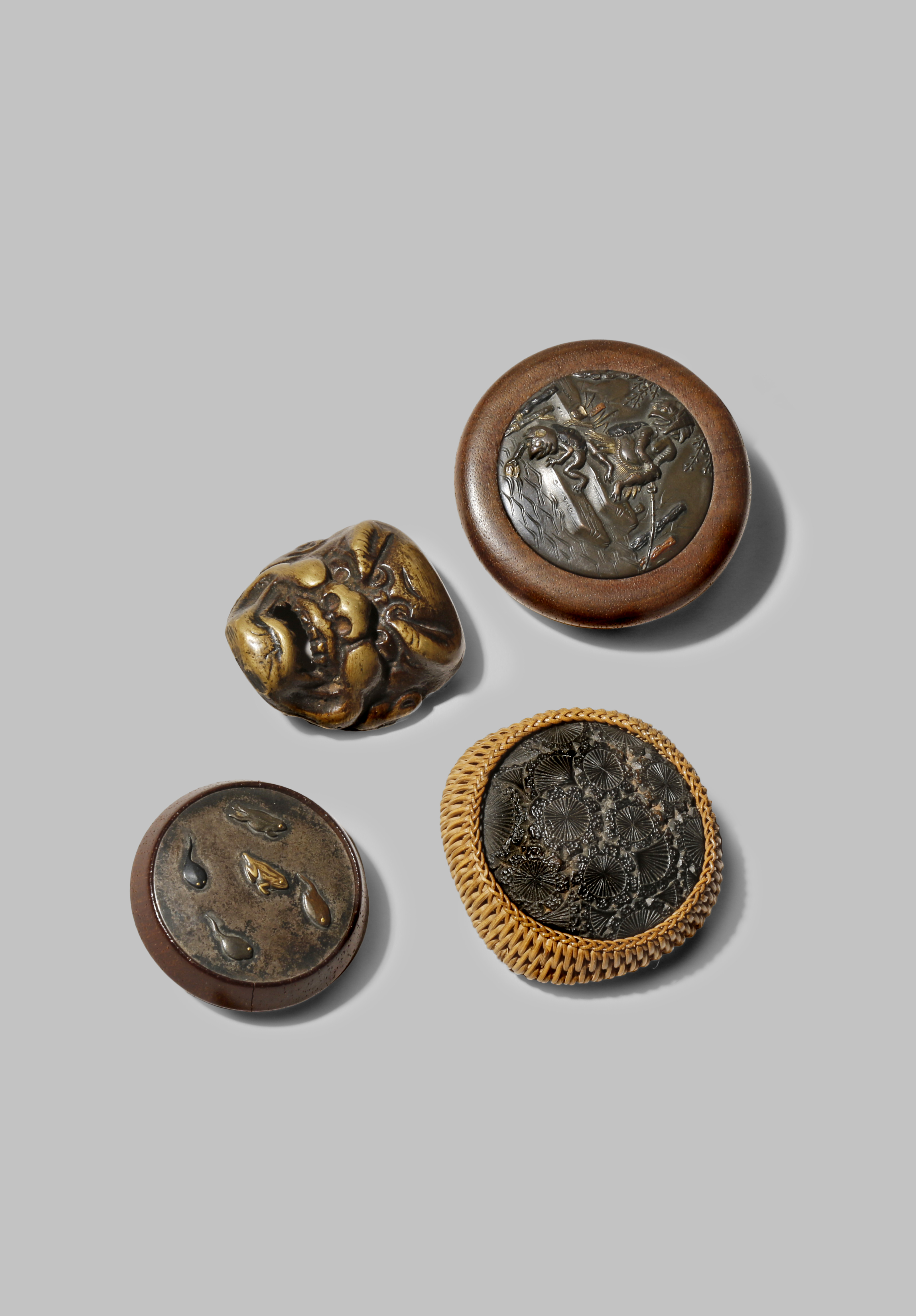 Two kagamibuta, one with a wood bowl and the lid with the five stages of a frog's life cycle, unsigned, the other with a wood and ivory bowl and a lid with two kappa fishing, signed in an amber reserve Shibayama, the third a manju depicting a basket of charcoal with a rattan bowl and an ebony lid, unsigned, the last a metal mask of a grimacing man, also unsigned, 5cm max. (4)