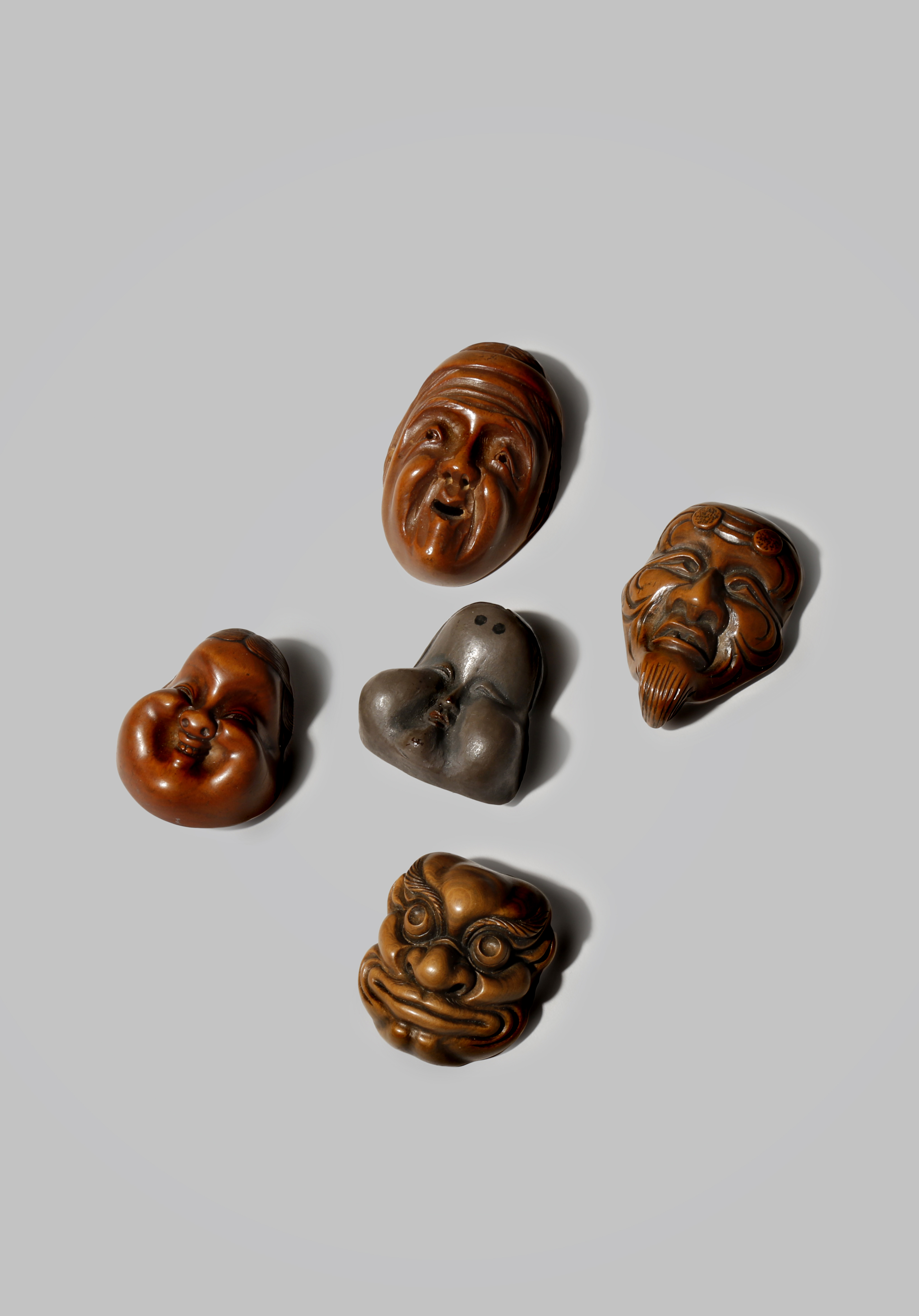 FIVE JAPANESE MASK NETSUKE MEIJI 1868-1912 Variously carved as two Okame