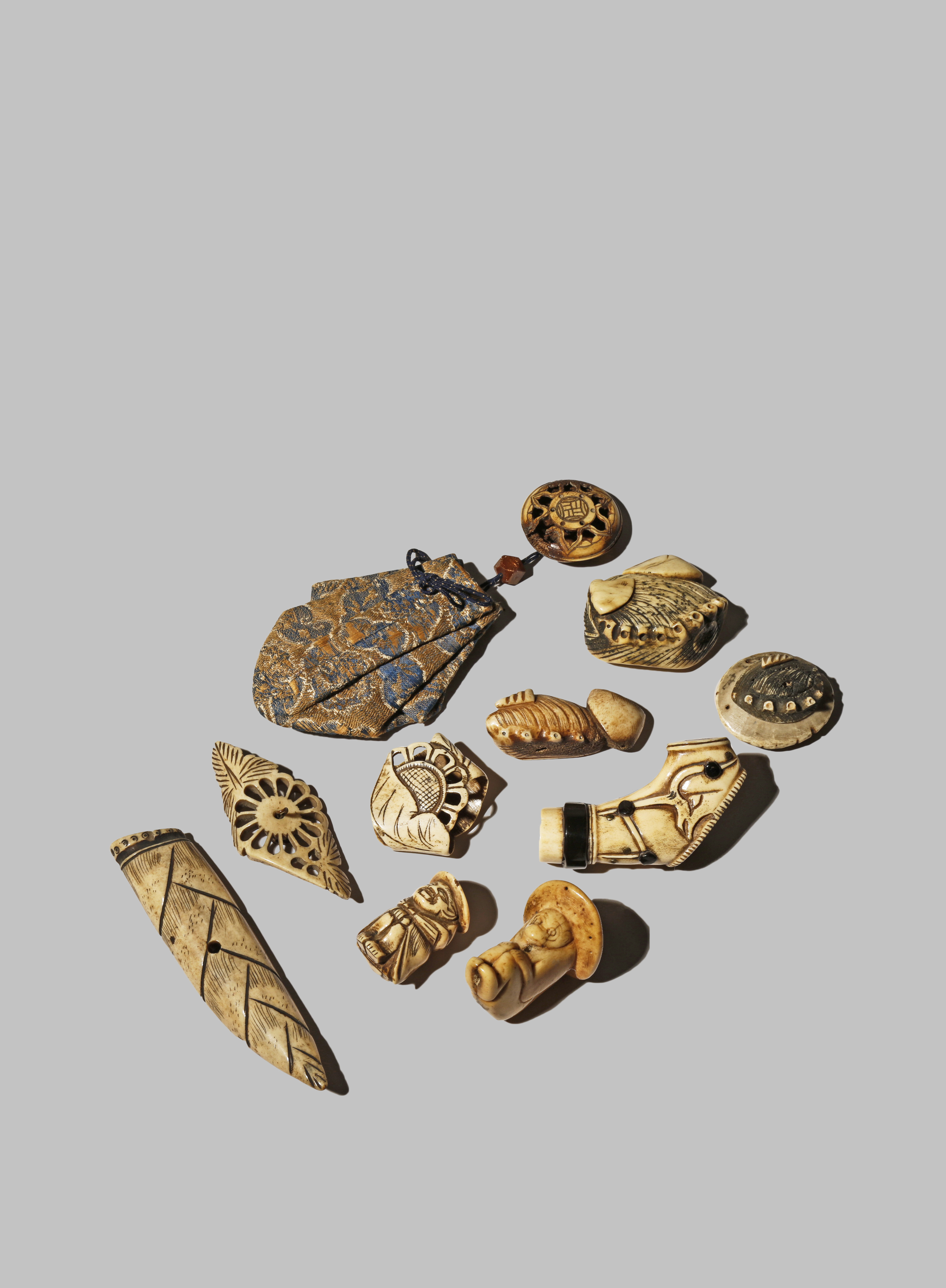 Variously carved as seashells, stylised flowers, a bamboo shoot, a crouching figure and a monkey, together with a ryusa attached to a fabric purse, 17cm max. (10)