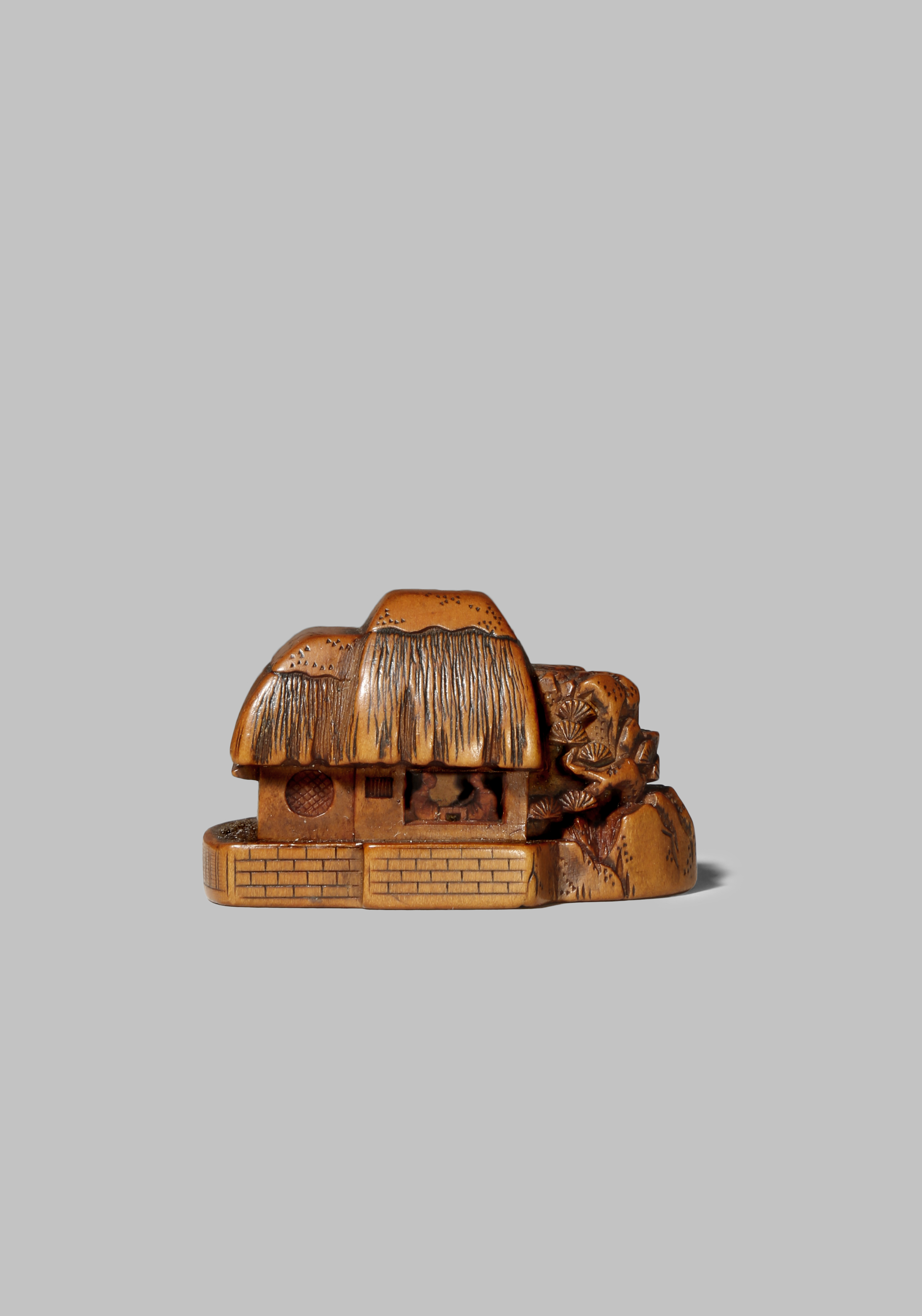 A JAPANESE WOOD NETSUKE EDO/MEIJI PERIOD Depicting a scholar's pavilion