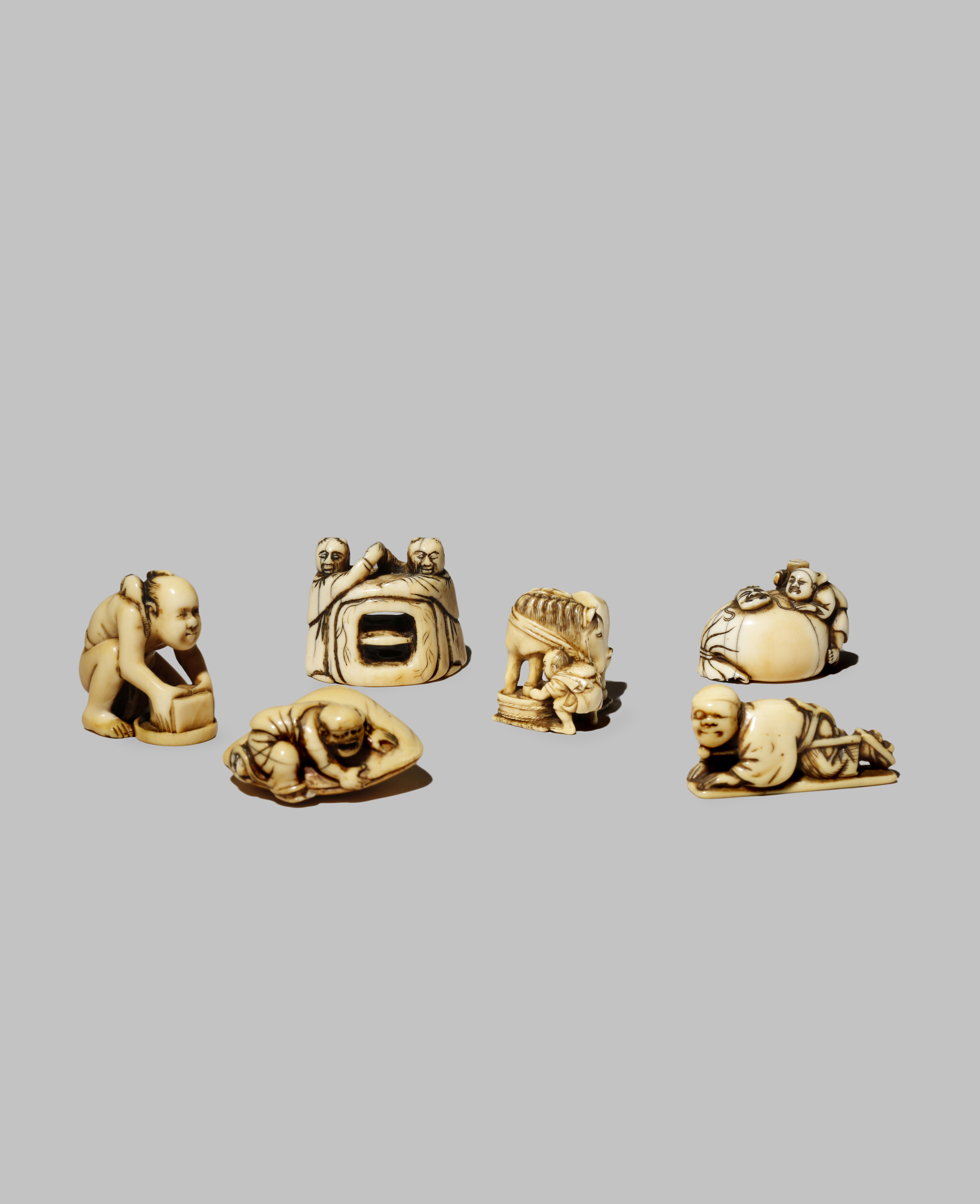 SIX JAPANESE IVORY NETSUKE EDO/MEIJI PERIODS Variously carved as two karako arm wrestling over a...