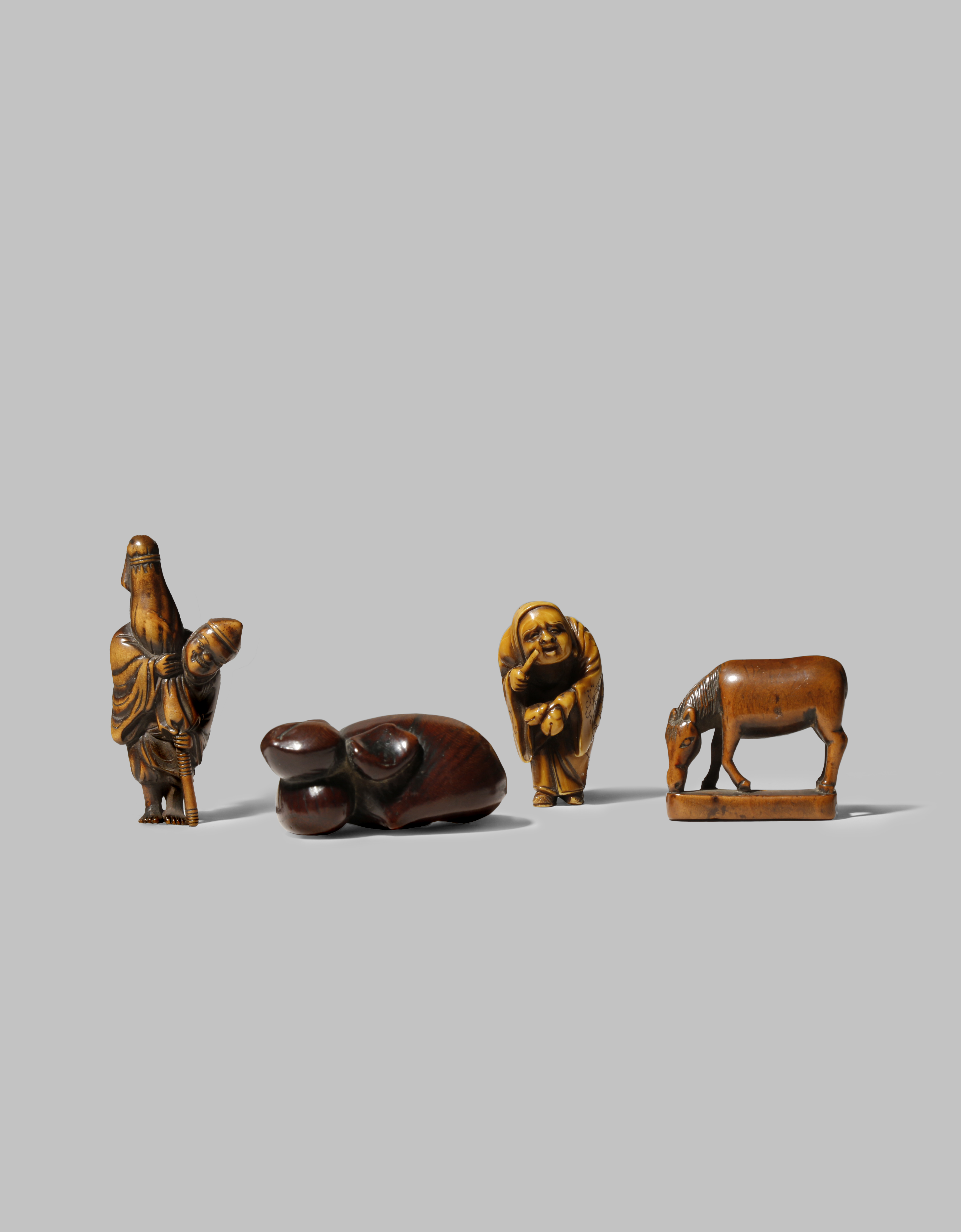 FOUR JAPANESE NETSUKE EDO/MEIJI PERIODS Three in wood