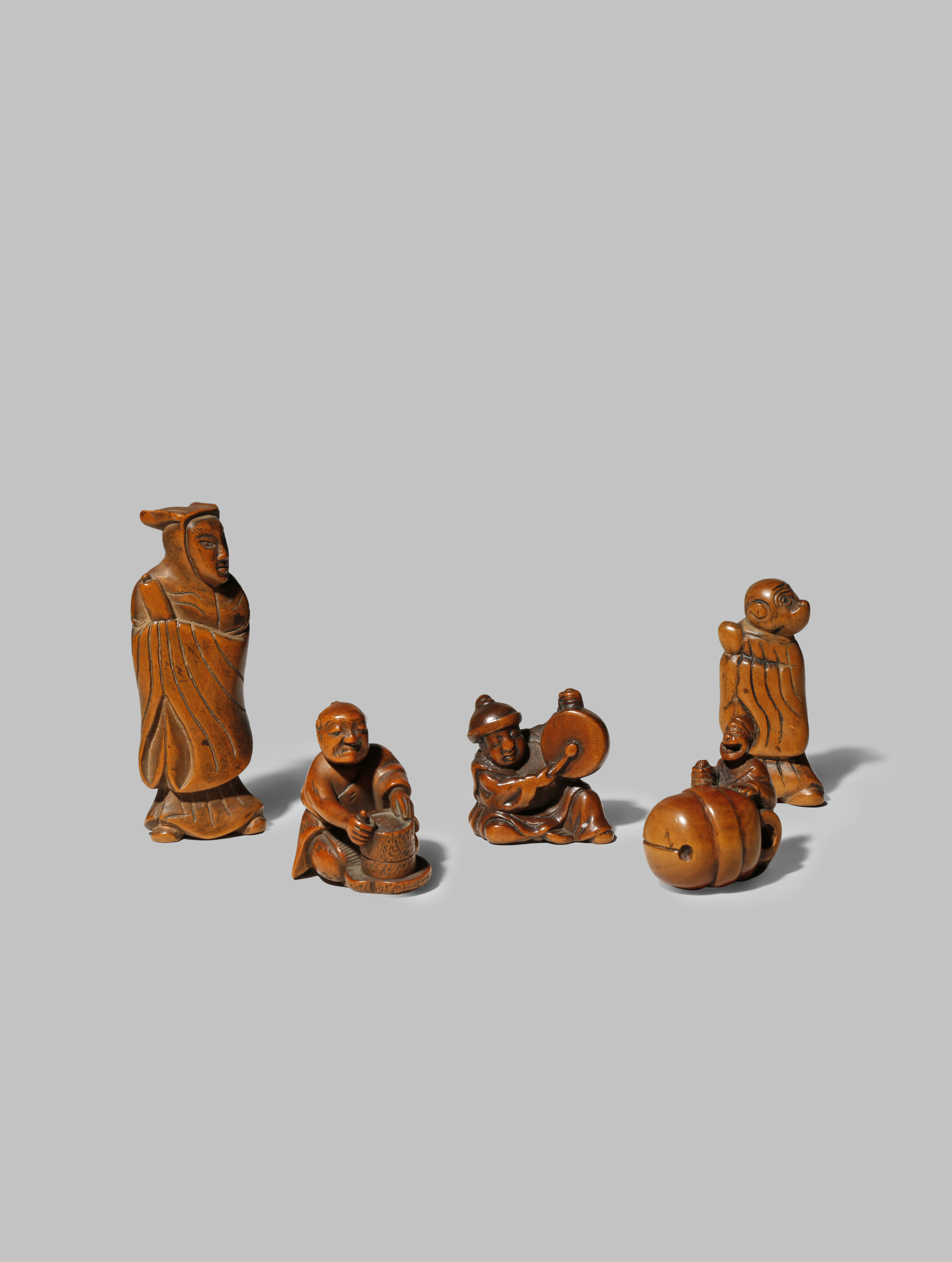 Four carved as figures, one beating a drum with a two character mark to the base, another a temple servant polishing a giant bell, the third with a moveable head holding a brazier and the last holding a fan, the fifth netsuke depicting a monkey dressed as a monk, all unsigned, 7.7cm. (5)