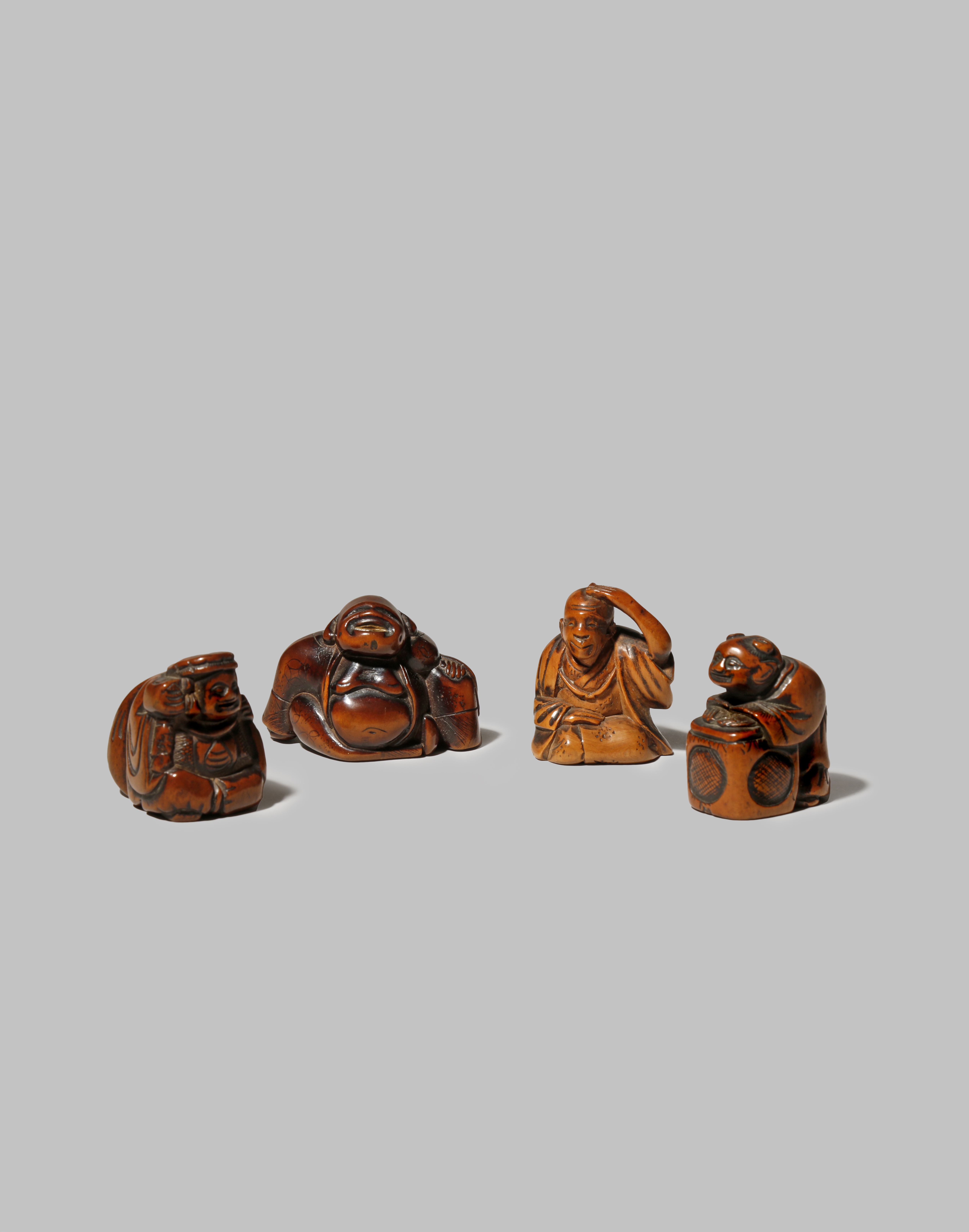 One carved as a karako on a hibachi brazier, one a seated man touching his head, another depicting Hotei and the last Daikoku carrying a large sack over his shoulder, 5.1cm max. (4)