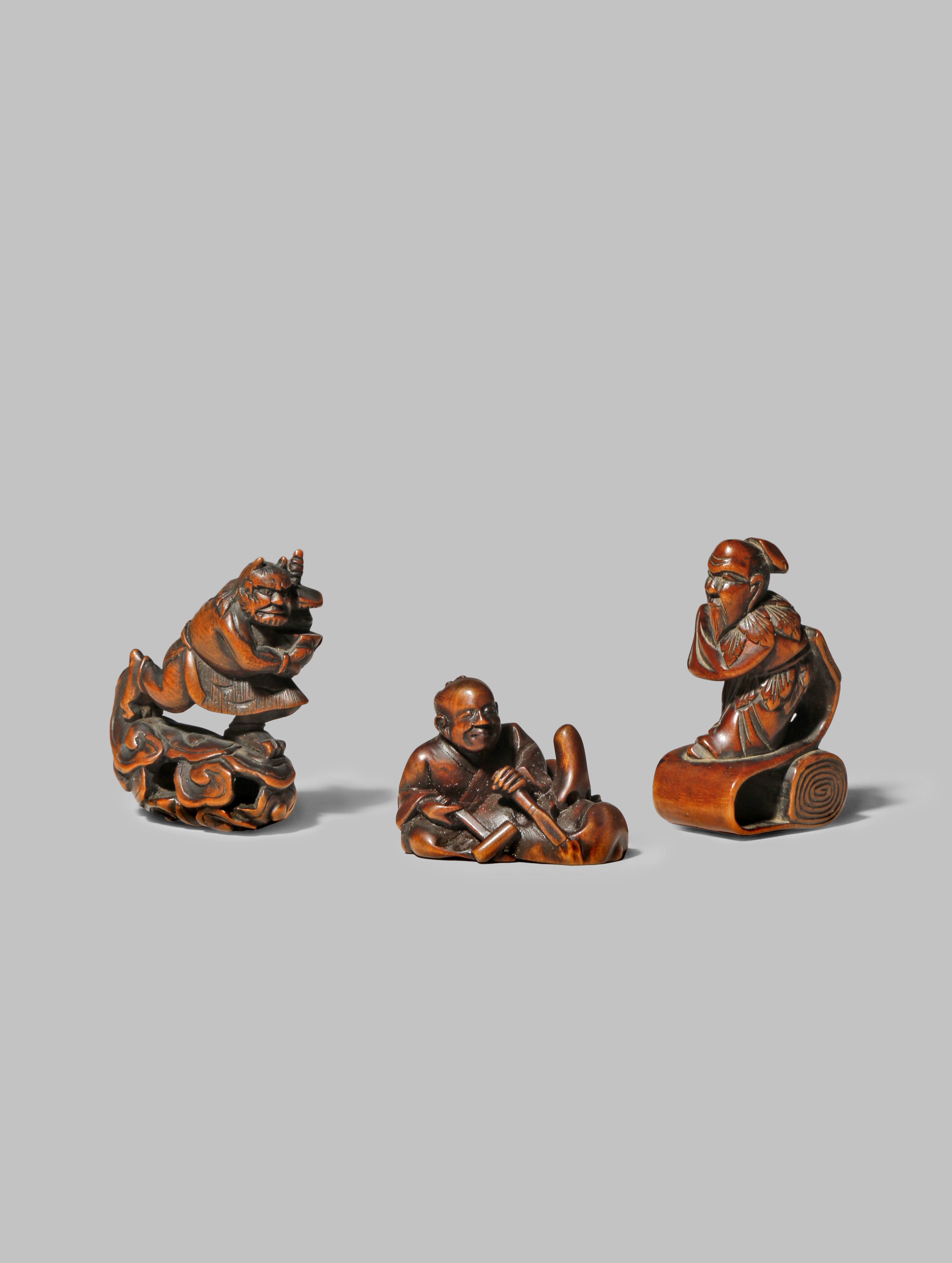 THREE JAPANESE WOOD NETSUKE MEIJI 1868-1912 One depicting Tentoki or Raiden standing on a cloud...