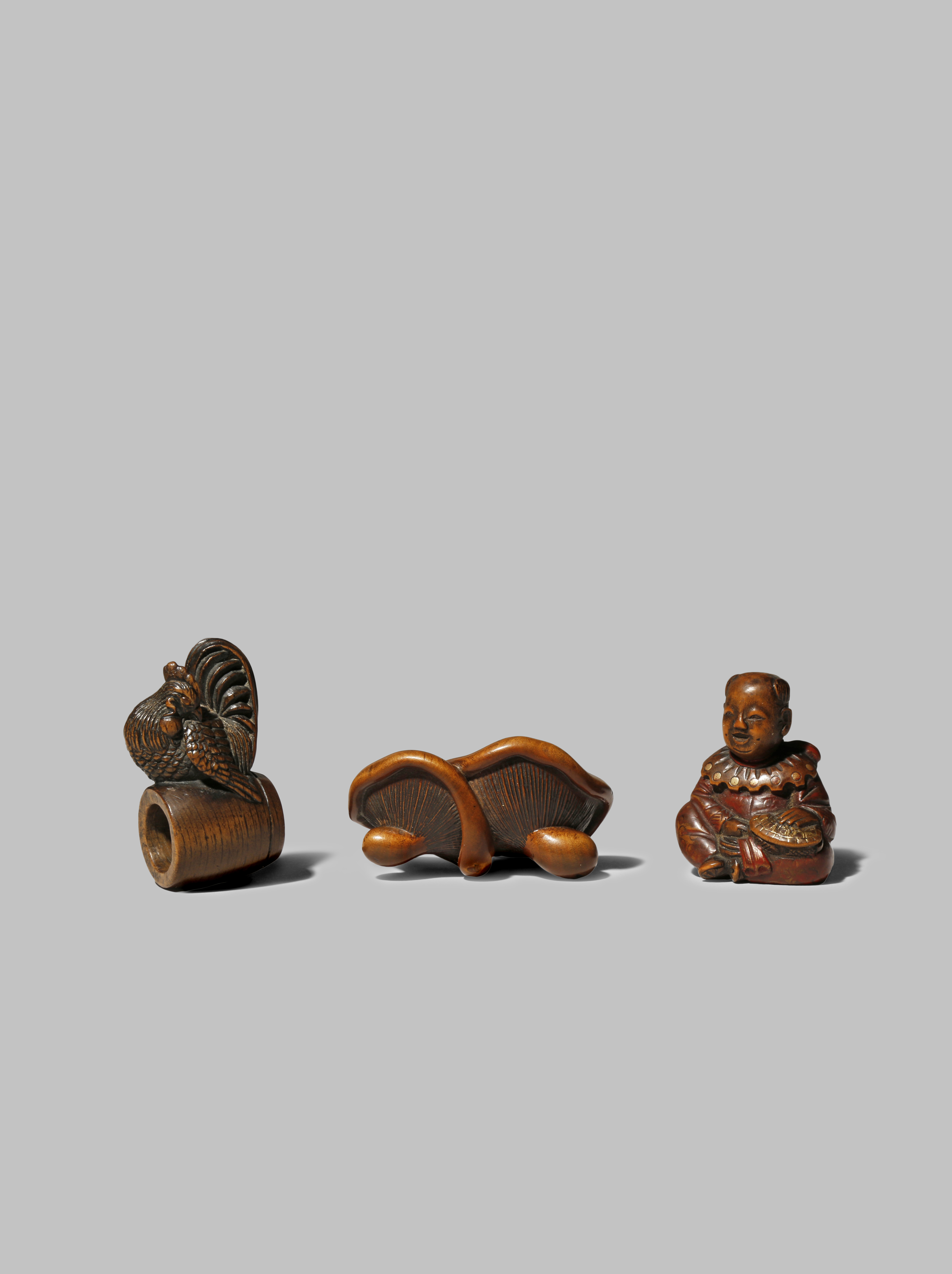 THREE JAPANESE WOOD NETSUKE EDO/MEIJI PERIODS One carved as two mushrooms