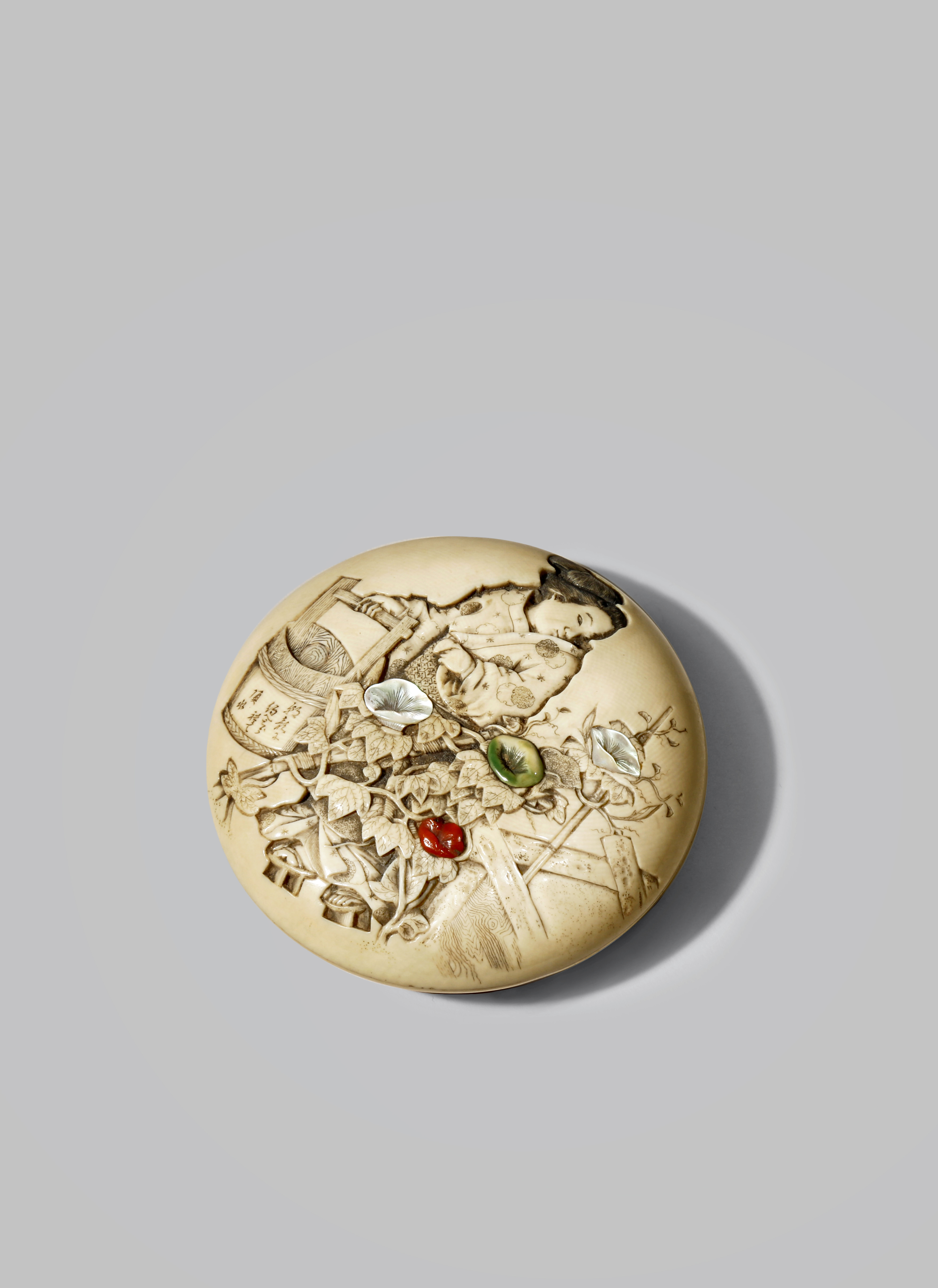 The lid decorated with a beauty carrying a water bucket and gazing at morning glories growing over trellis, the petals inlaid with mother of pearl, coral and stained ivory, the underside with a small stream, grasses, butterflies and dragonflies, signed Chikahiro in a mother of pearl oval reserve, 7.9cm. (2)