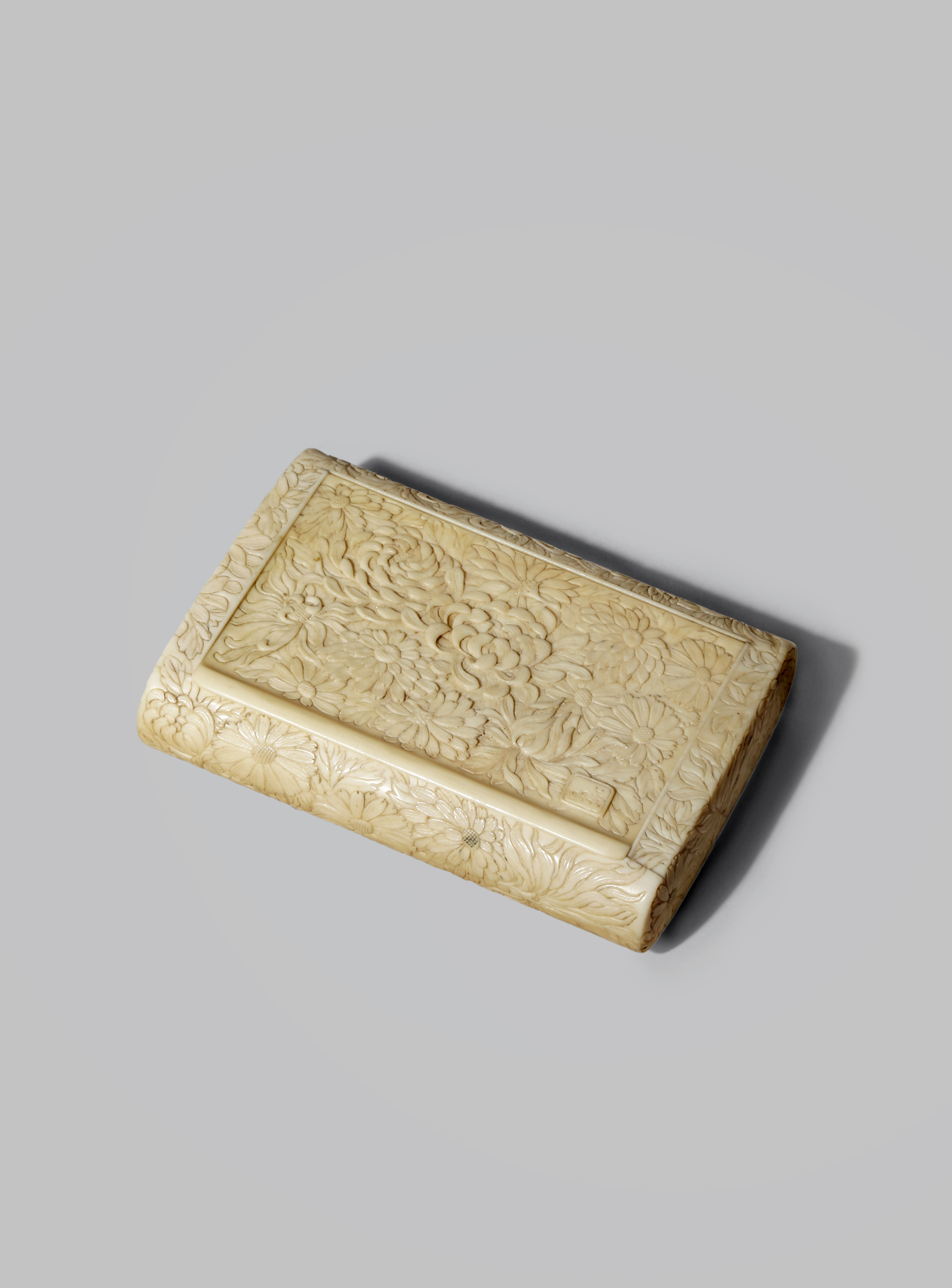 A JAPANESE IVORY CARD CASE MEIJI 1868-1912 Decorated all over with a dense pattern of flowerheads...